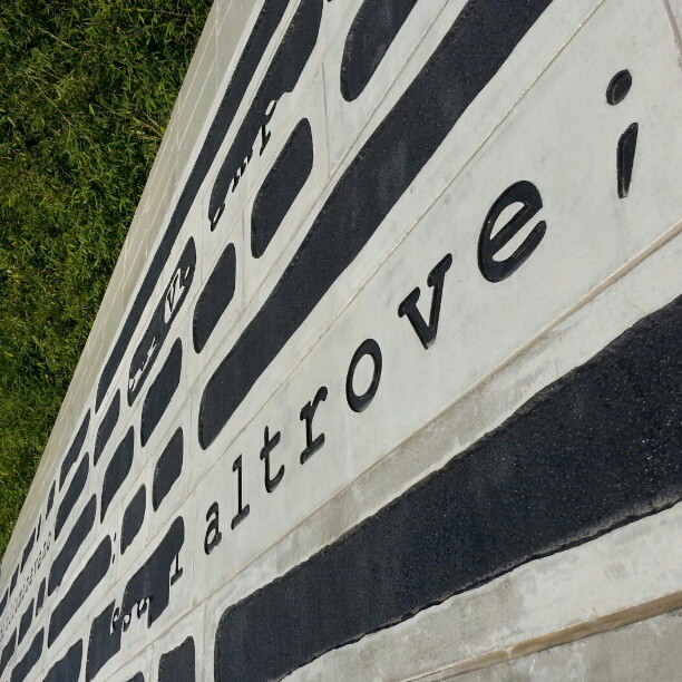 Intervento di Emilio Isgrò su un passo tratto da Il ponte della Ghisolfa di Giovanni Testori. Un bassorilievo lungo 23.40 metri e alto 2, 47, un nuovo testo vivissimo con parole di mezzo secolo fa – le parole sopravvissute si possono toccare, vi cadono sopra le foglie – vicino al vero ponte della Ghisolfa, quello vecchio, e al nuovissimo ponte pedonale che lo sovrasta. In una rete di linee che si intersecano, ragionando sulla speculazione edilizia, incrociando l’architettura, l’arte, ascoltando gli echi della letteratura del novecento, proiettando ombre nei giorni dei morti e dei santi. E tutto – parole, cemento, ex vite ed intenzioni – mi sembra vivo e al di là dell’utile/inutile, del bello/brutto, del giusto/sbagliato. È banalmente forma del tempo che passa e in questi giorni complicati, dove le domande non trovano risposta, risulta comodo ripassare ritmi semplici e inalterabili.