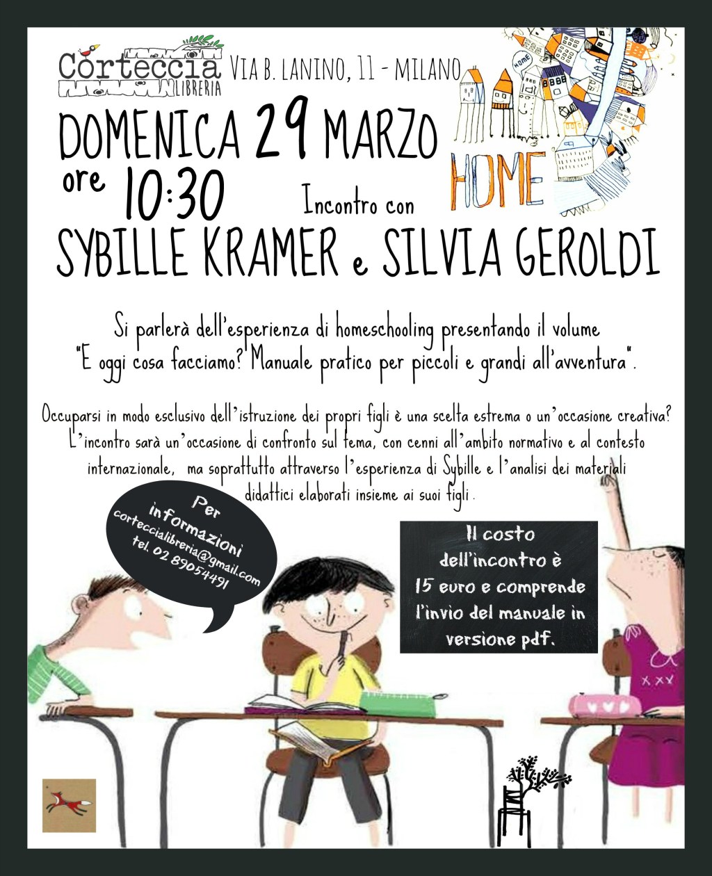 Il manuale è uscito da qualche mese, ormai, e abbiamo scoperto che diversi insegnanti lo hanno acquistato e utilizzato. Per questo ci piacerebbe avere tra il pubblico persone che lavorano nella scuola… non per sterili polemiche pro o contro l’homeschooling, che con noi non trovano terreno (ribadisco: mia figlia frequenta una scuola pubblica), ma per un reale confronto che arricchisca tutti. Vi va di spargere la voce tra gli amici insegnanti e a scuola? Anche perché Sybille è di Bolzano, la sua “calata su Milano” non è cosa da tutti i giorni…