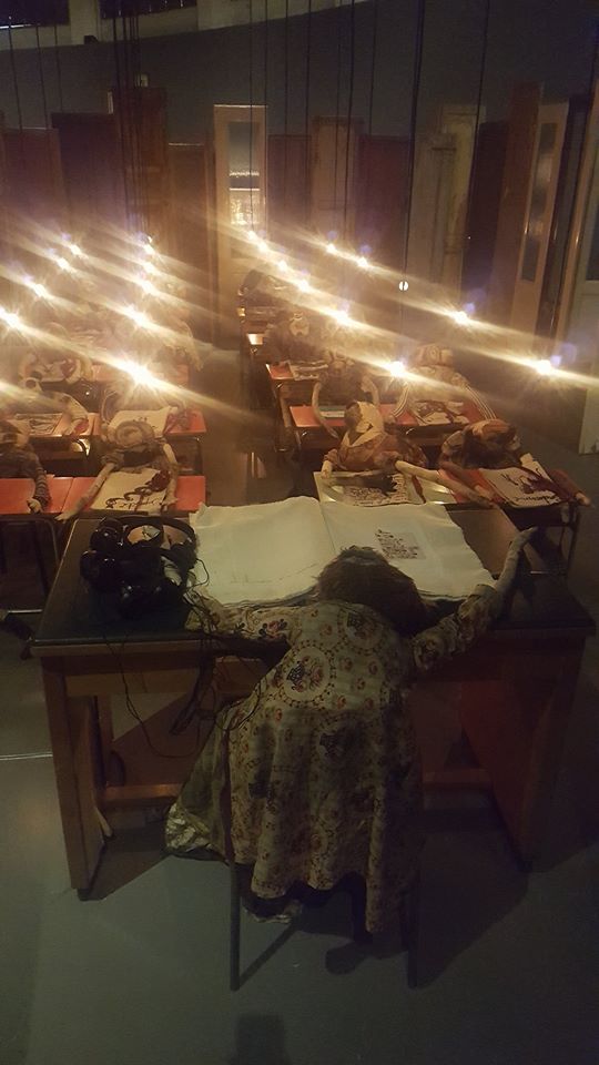 L’installazione percorribile che rappresenta la scuola, con la maestra stremata, i fantocci buffi e tragici seduti e debordanti rispetto al banco, i libri di filastrocche che li supportano, le paure disegnate, l’adulto cattivo dietro la lavagna. Ci sono alcune cuffie: ecco una anziana voce femminile che recita una maestra tradizionale, urlante, isterica. È una finzione, i bambini collaborano e ridacchiano, l’alone di angoscia si scioglie nello scherzo.