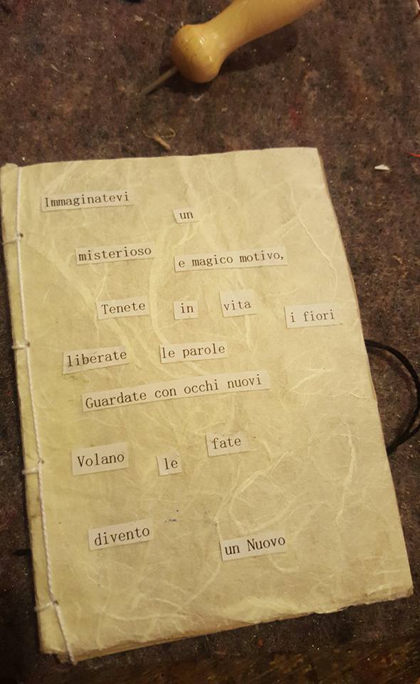 Questa volta, all’Osservatorio Figurale, ho raccontato di me. Dell’ufficio, del web come unica finestra, del piacere di assemblare carte e cucirle per trasformare il brutto in qualcosa d’altro. Ho chiesto ai partecipanti, un gruppo misto di adulti e bambini, di giocare con ritagli di carta e timbri dall’aria vintage, di usare la matita per annerire il foglio e disegnare cancellando. Abbiamo cucito dei quadernini con la tecnica della rilegatura orientale, senza usare il righello, mai.