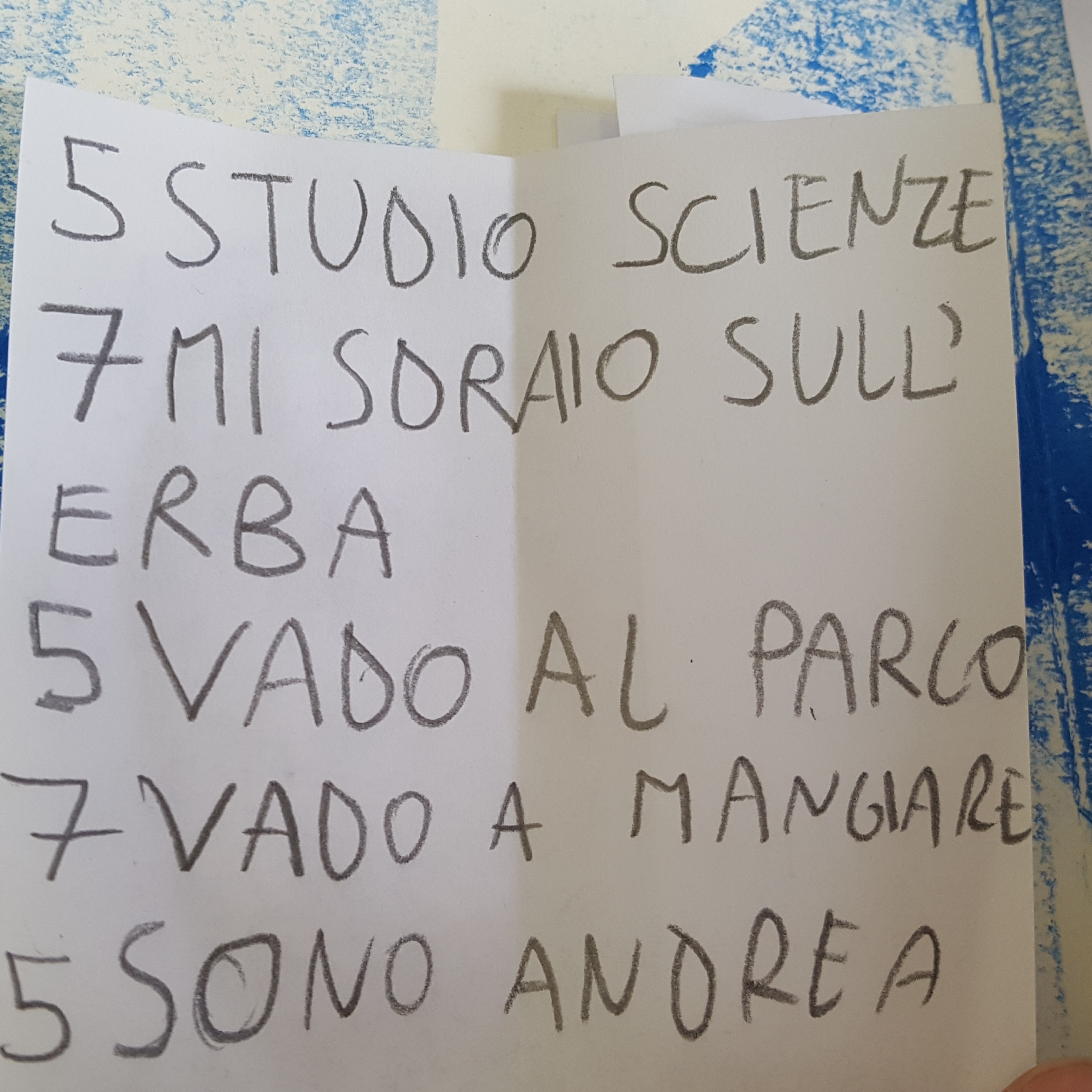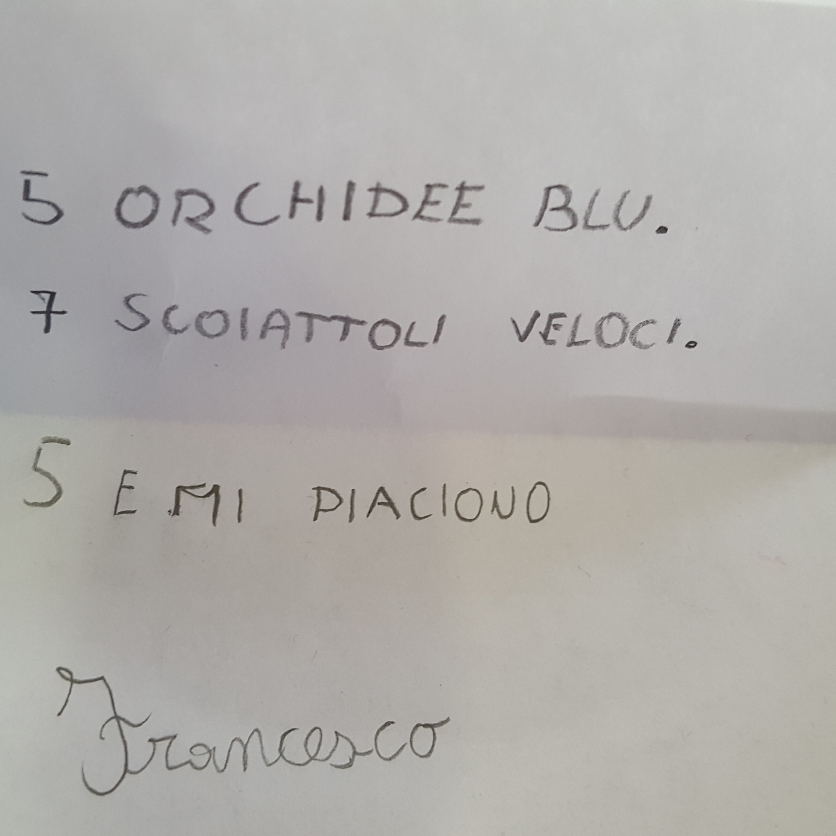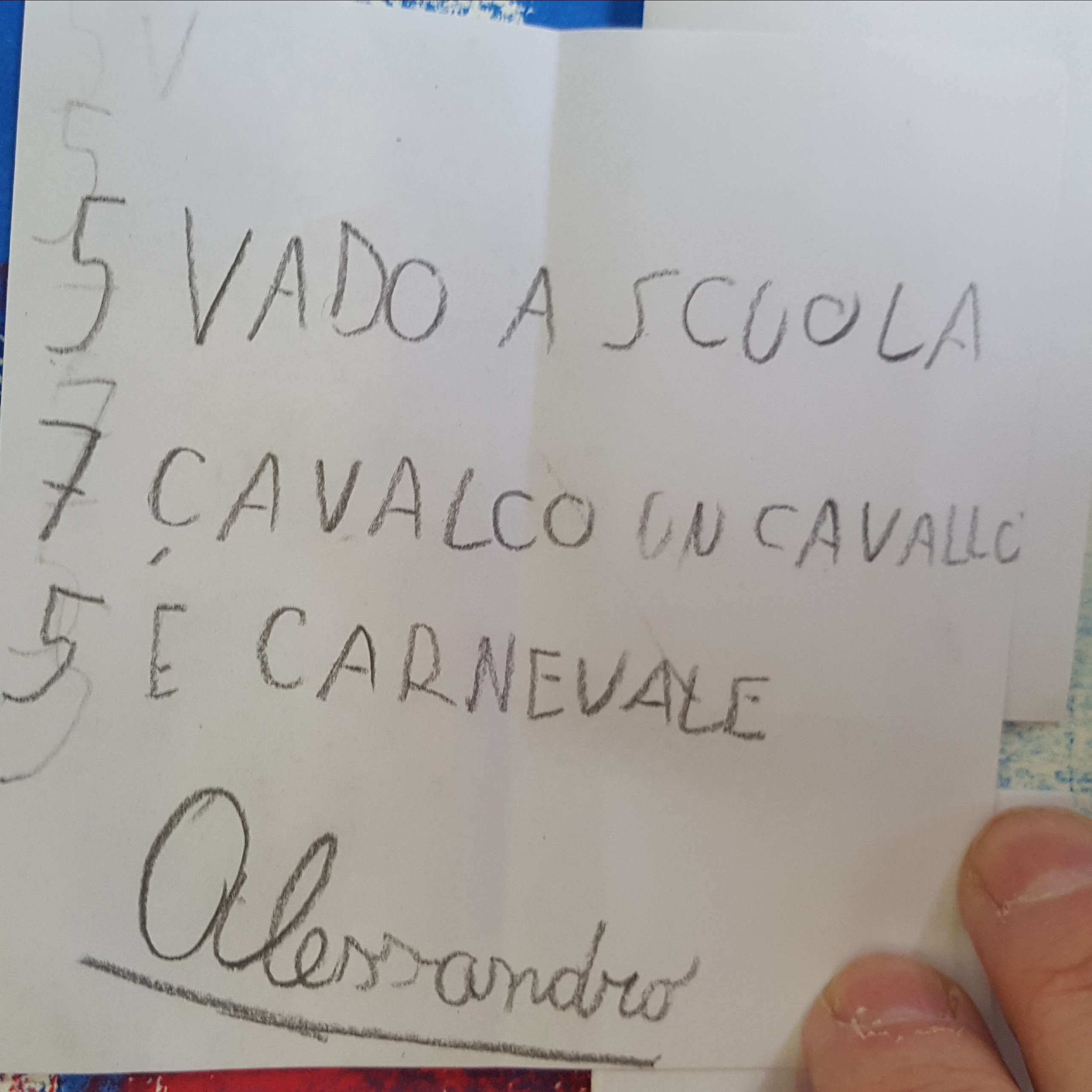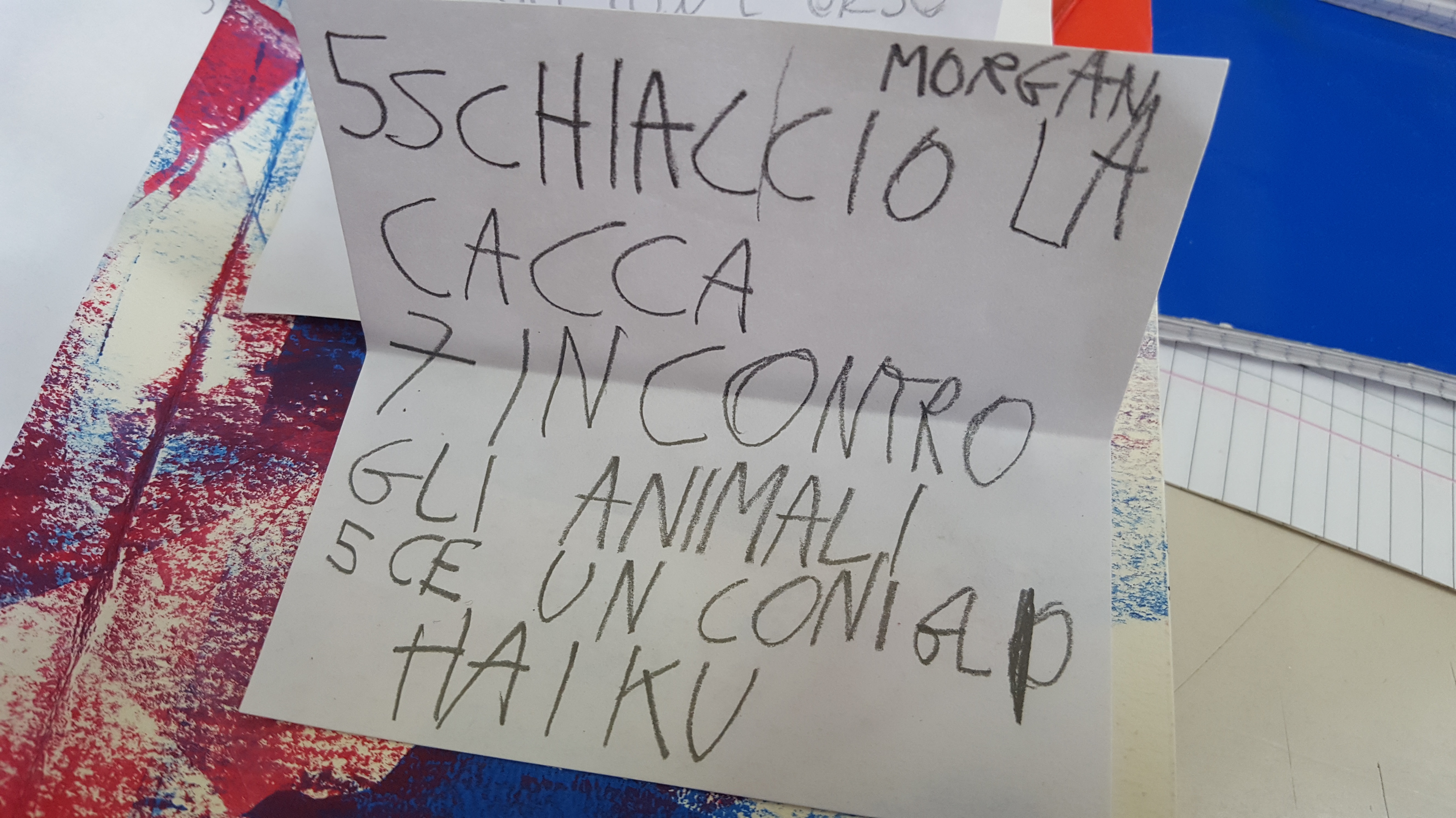 Oggi è il turno di una terza impetuosa. La forza è tale che non ho troppo tempo da dedicare a ciascun bambino, verificando il numero di sillabe e aggiustando i componimenti. Ma che importa? Qui c’è urgenza di scrivere, di giocare con le parole, di domare t-rex. Nella foga, escono umorismo e dolcezza, forse persino nuovi generi letterari (haiku incatenato?).