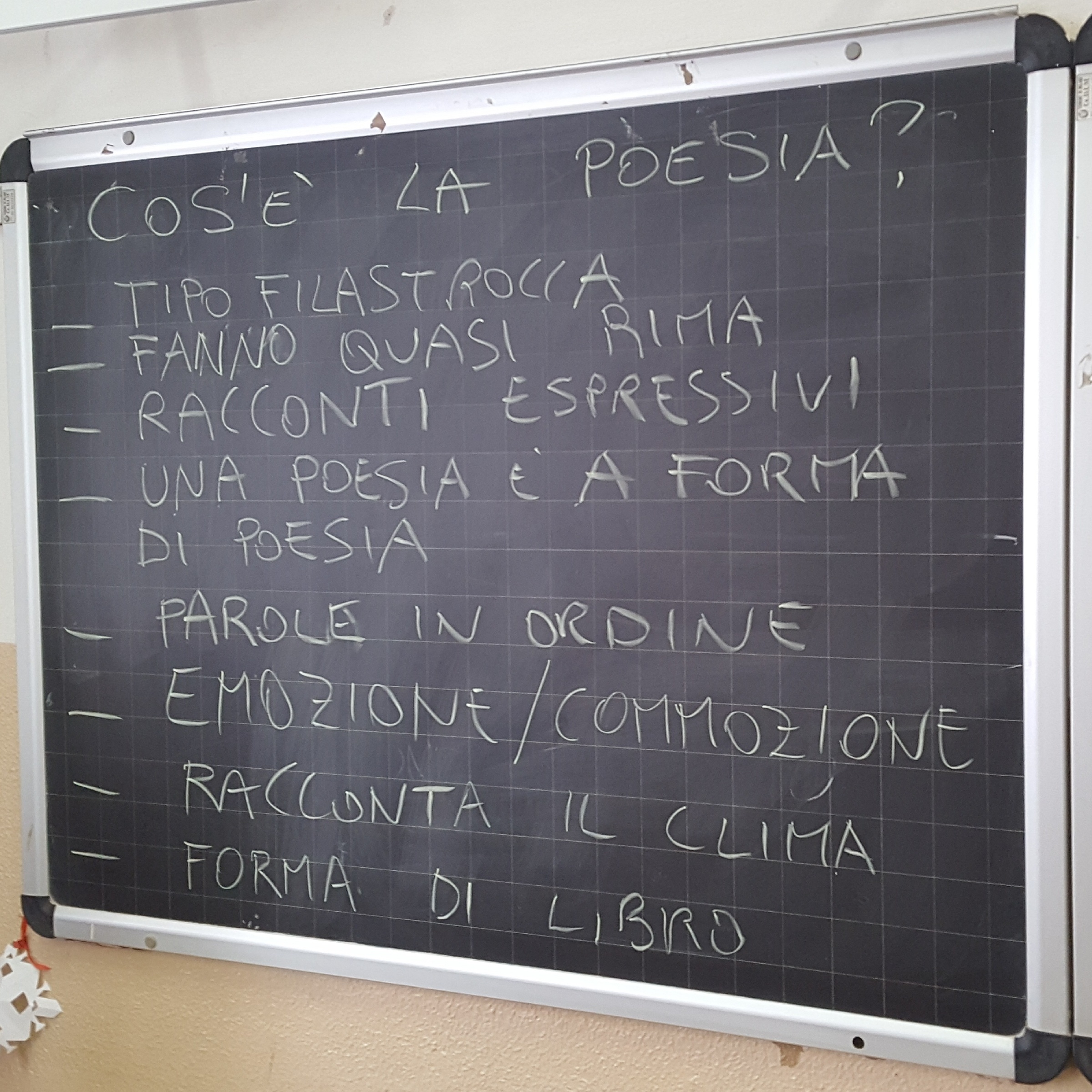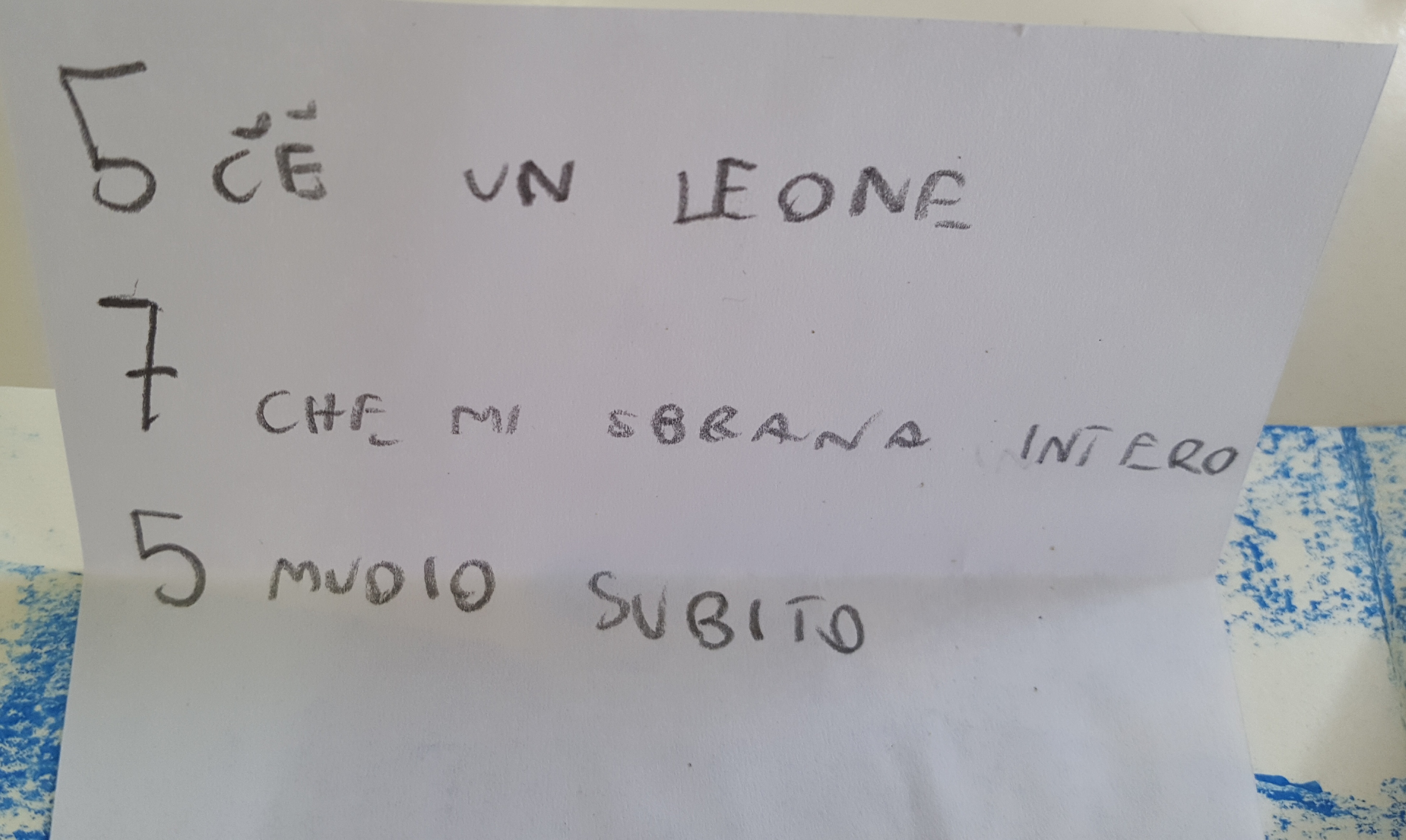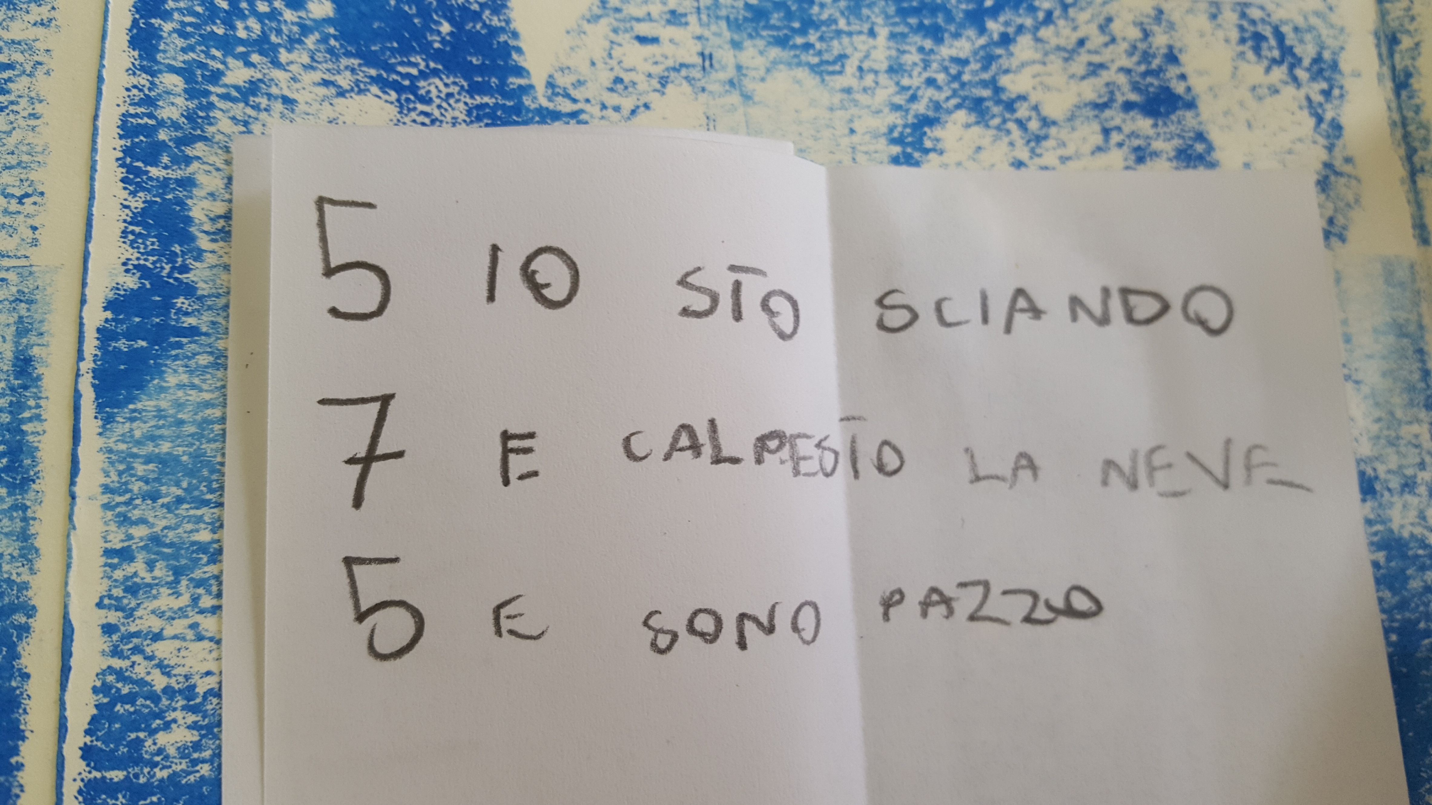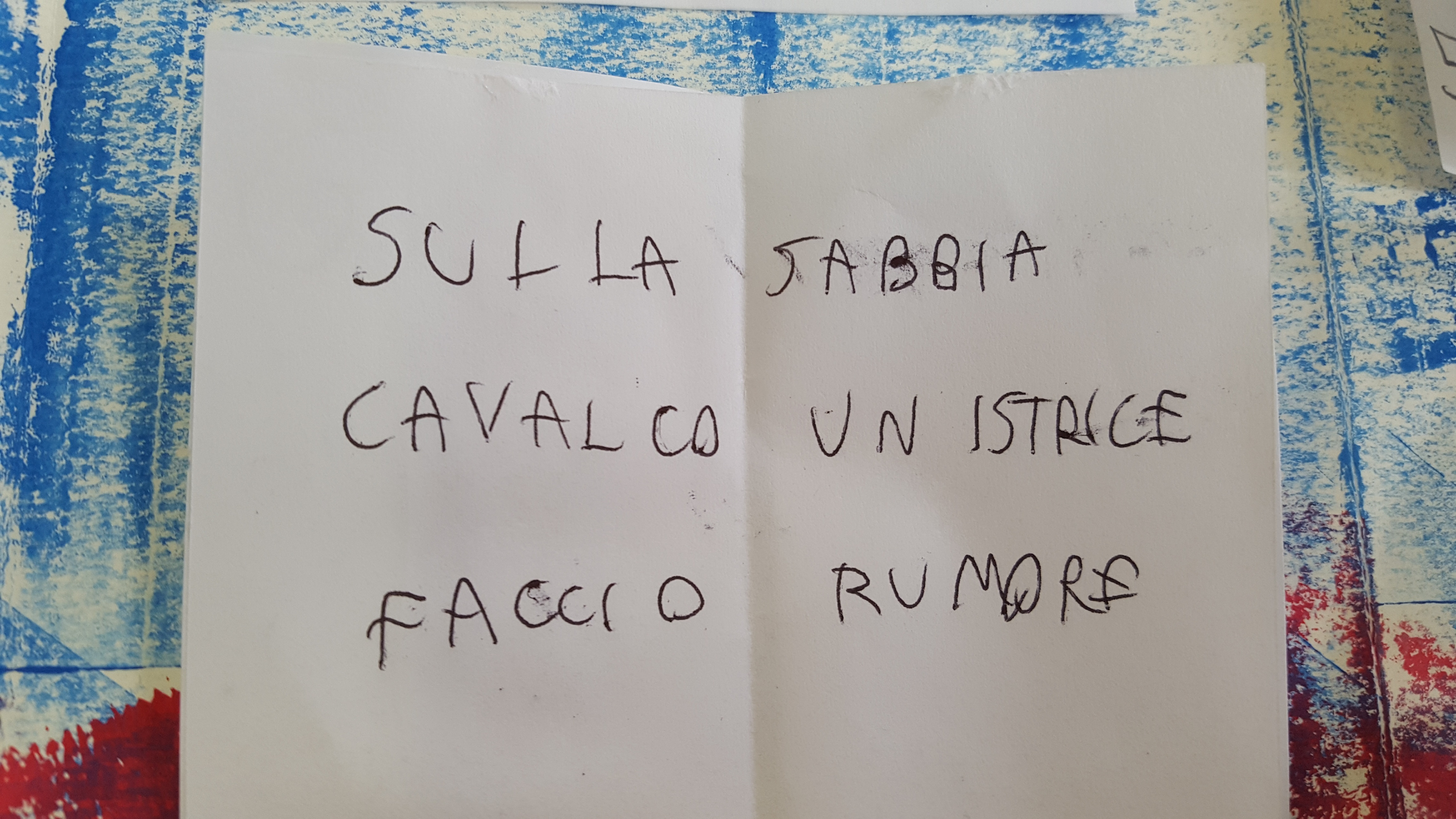 Oggi è il turno di una terza impetuosa. La forza è tale che non ho troppo tempo da dedicare a ciascun bambino, verificando il numero di sillabe e aggiustando i componimenti. Ma che importa? Qui c’è urgenza di scrivere, di giocare con le parole, di domare t-rex. Nella foga, escono umorismo e dolcezza, forse persino nuovi generi letterari (haiku incatenato?).