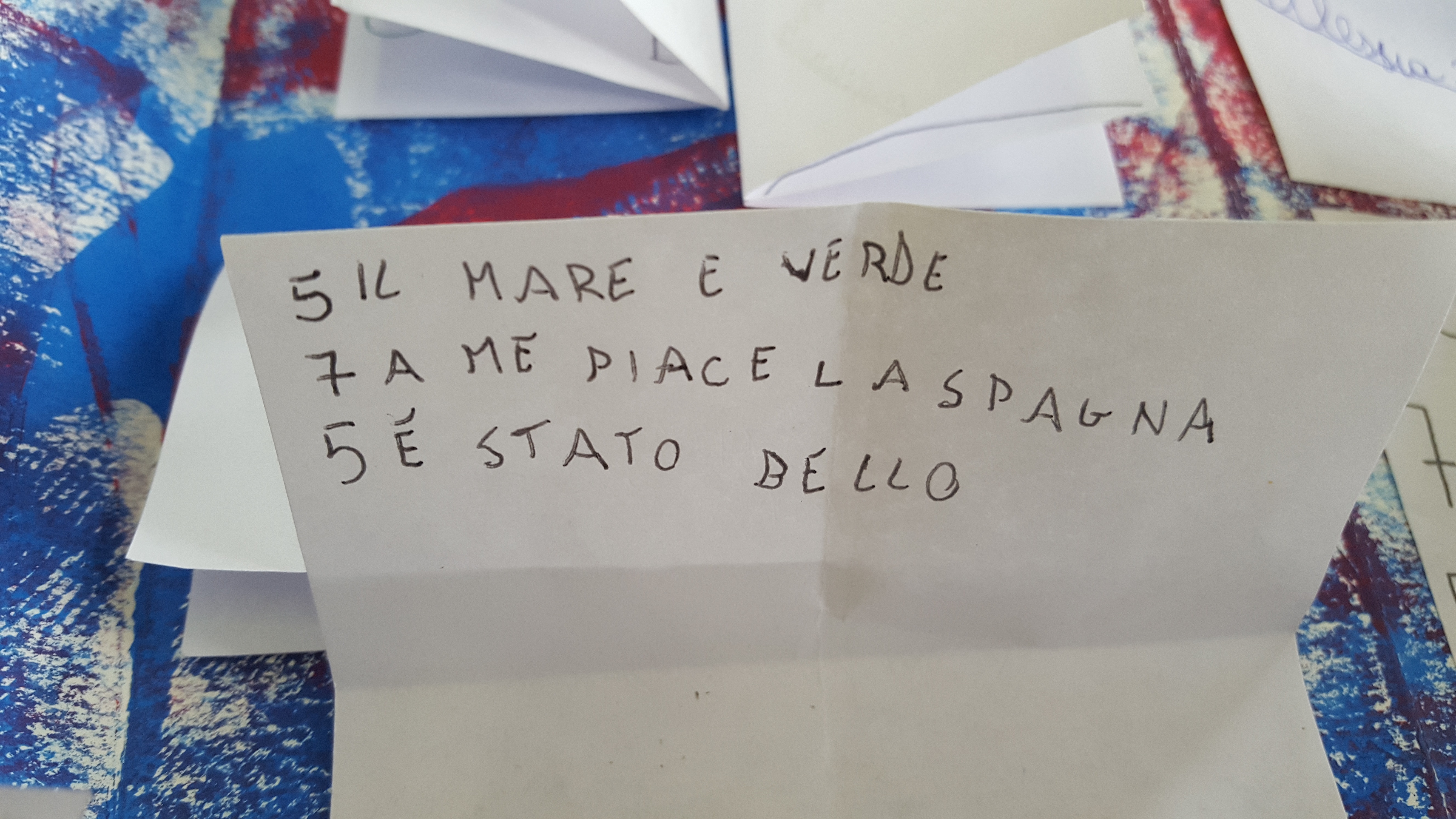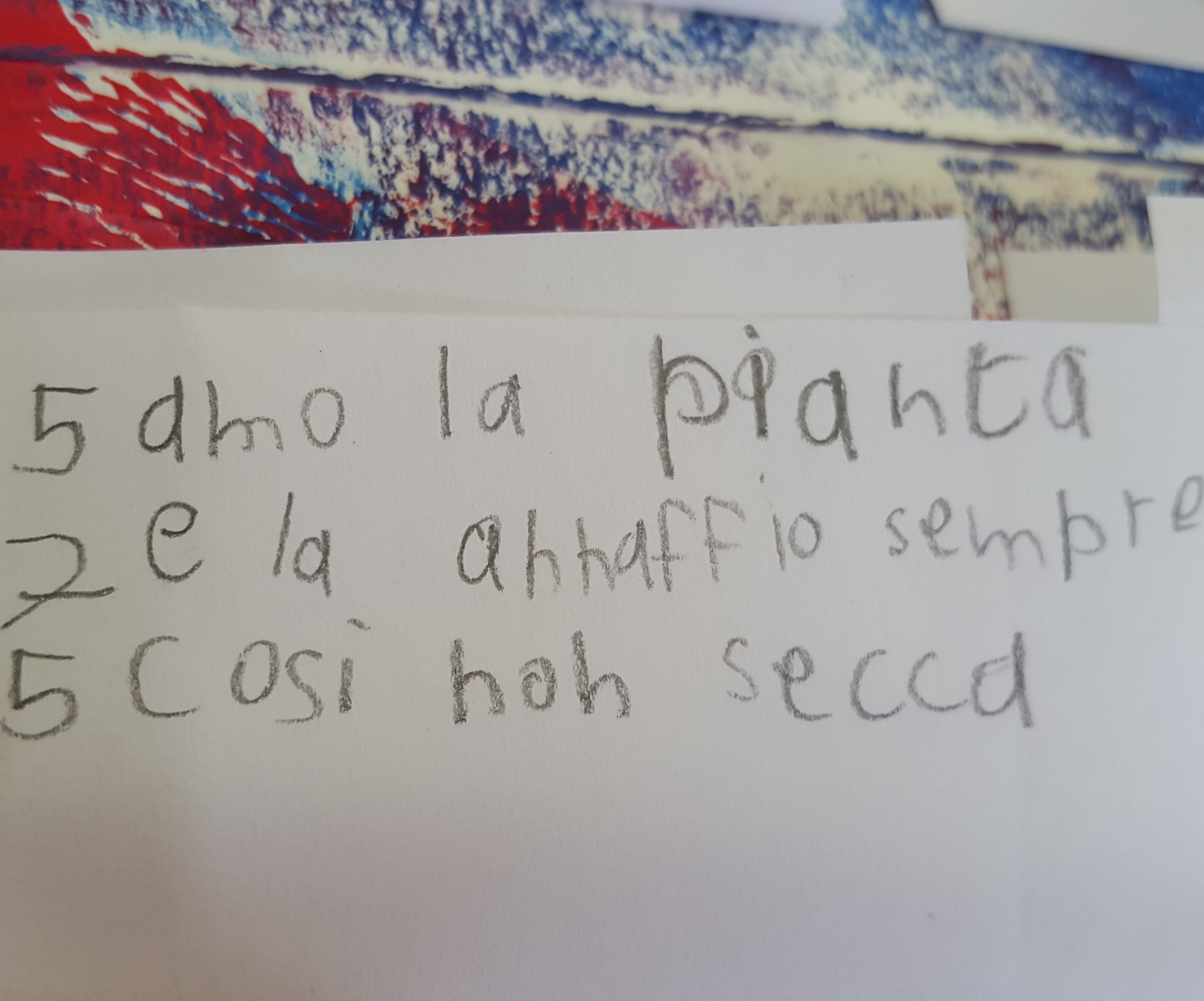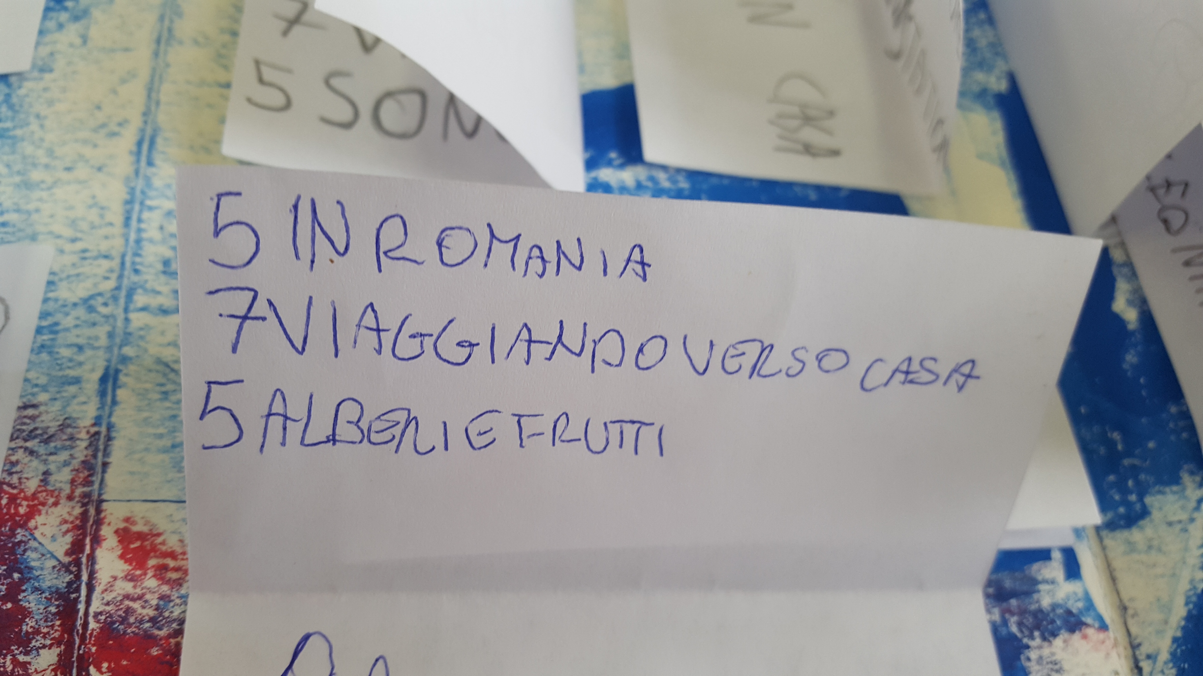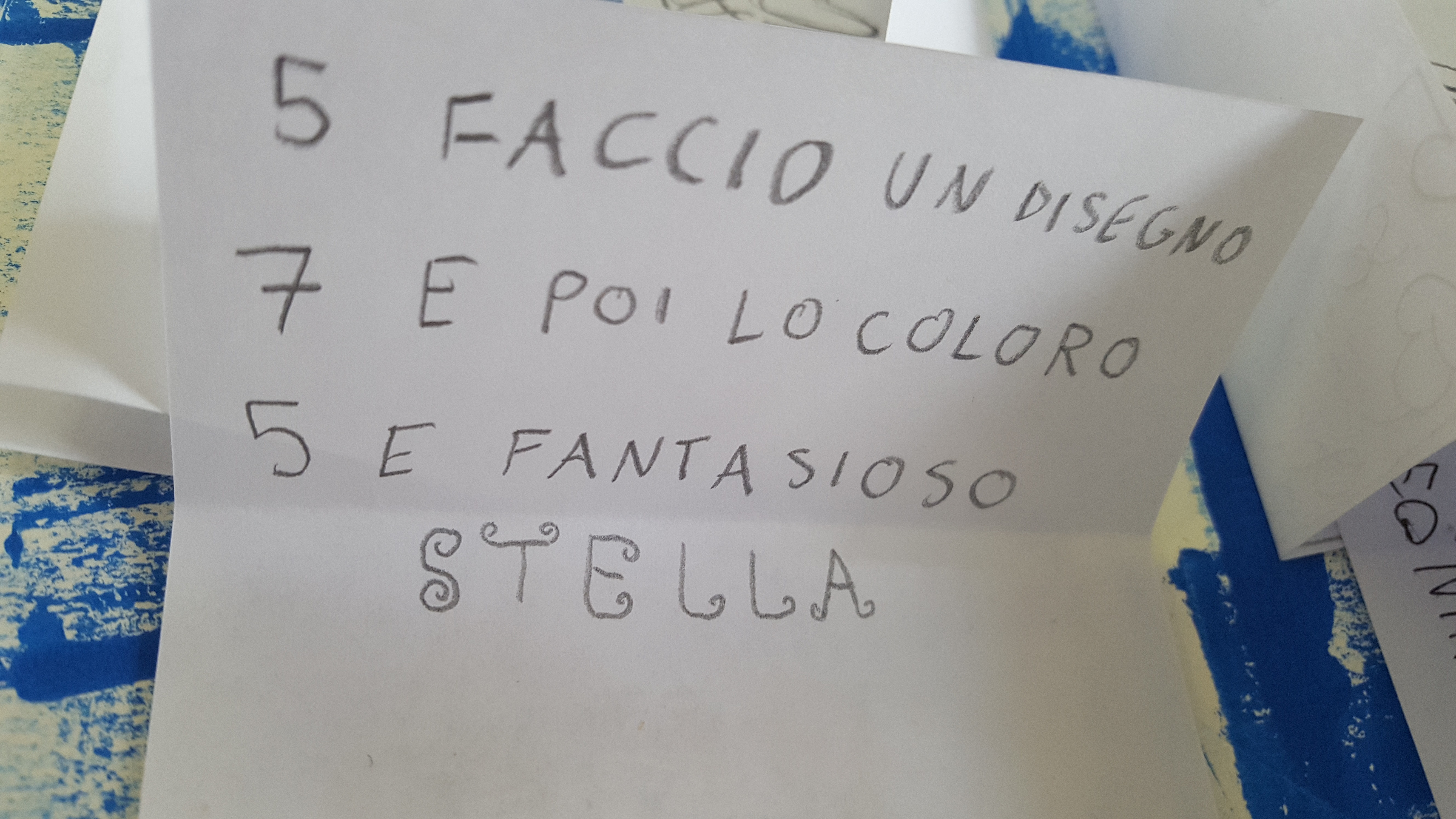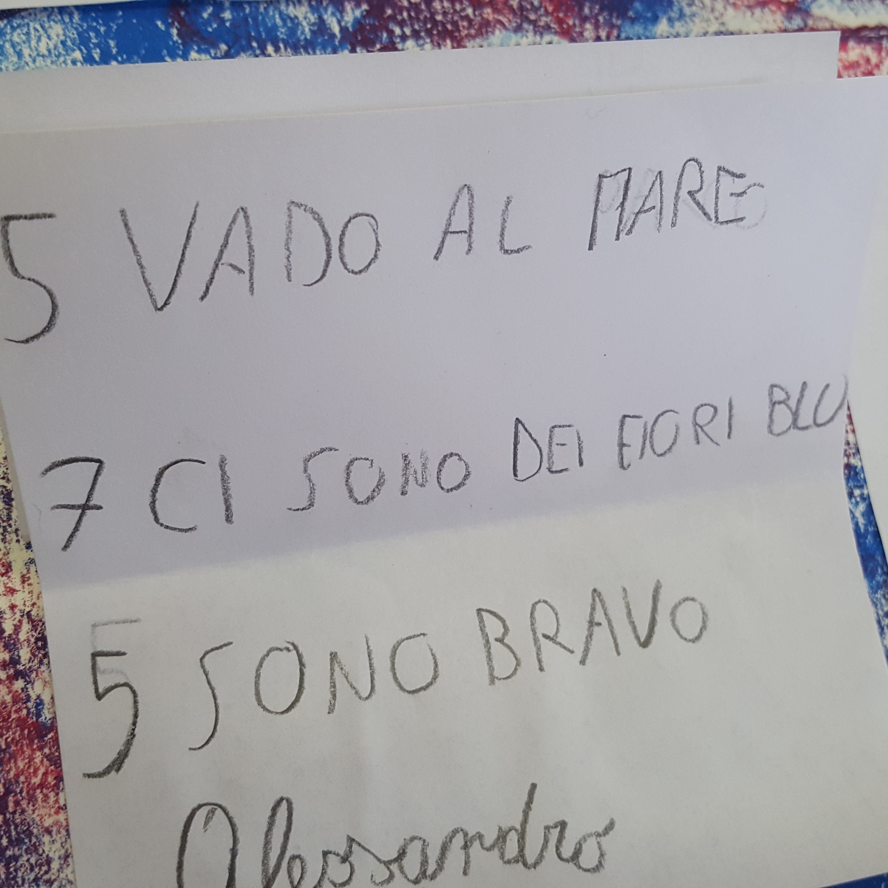 Oggi è il turno di una terza impetuosa. La forza è tale che non ho troppo tempo da dedicare a ciascun bambino, verificando il numero di sillabe e aggiustando i componimenti. Ma che importa? Qui c’è urgenza di scrivere, di giocare con le parole, di domare t-rex. Nella foga, escono umorismo e dolcezza, forse persino nuovi generi letterari (haiku incatenato?).