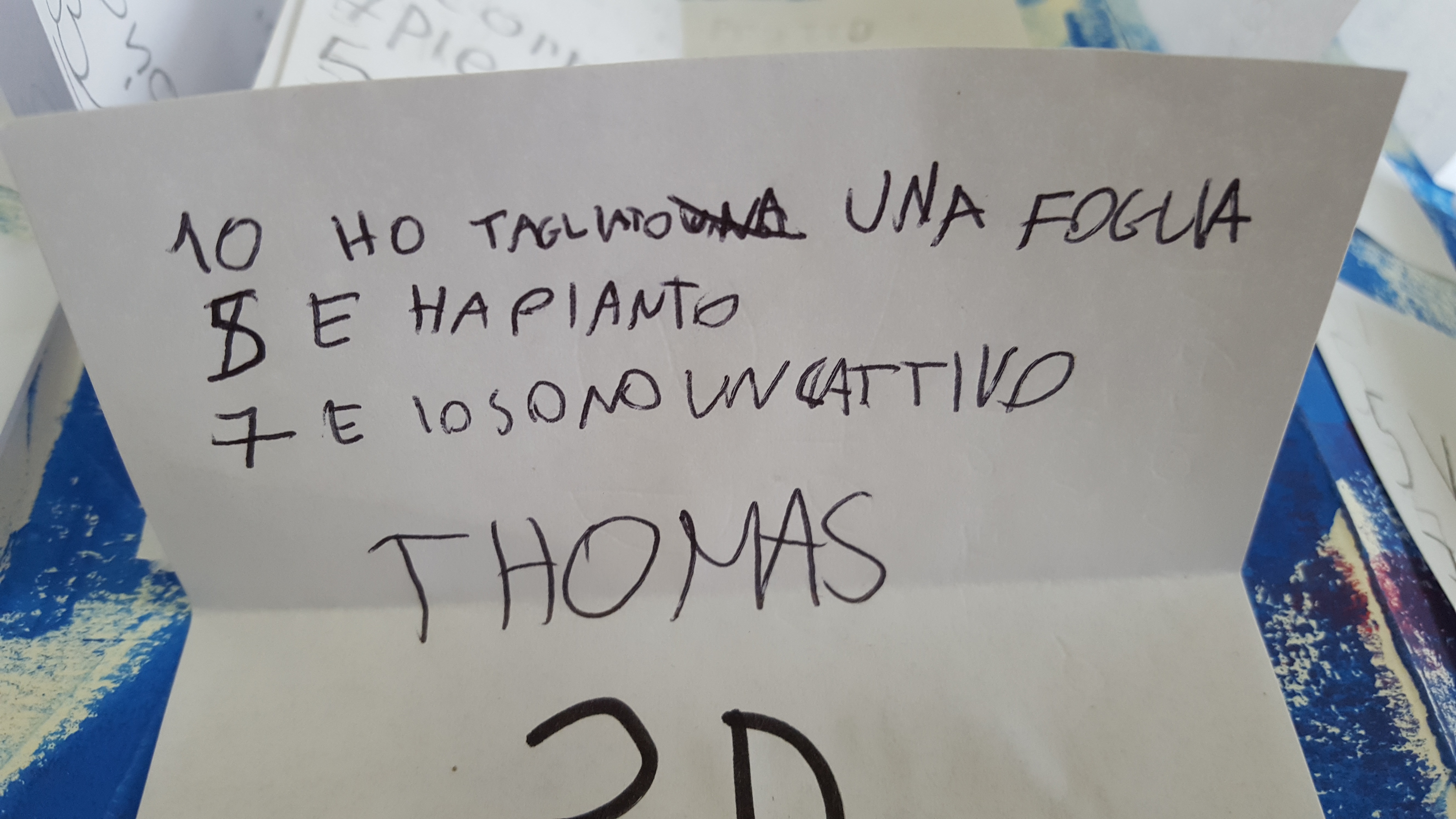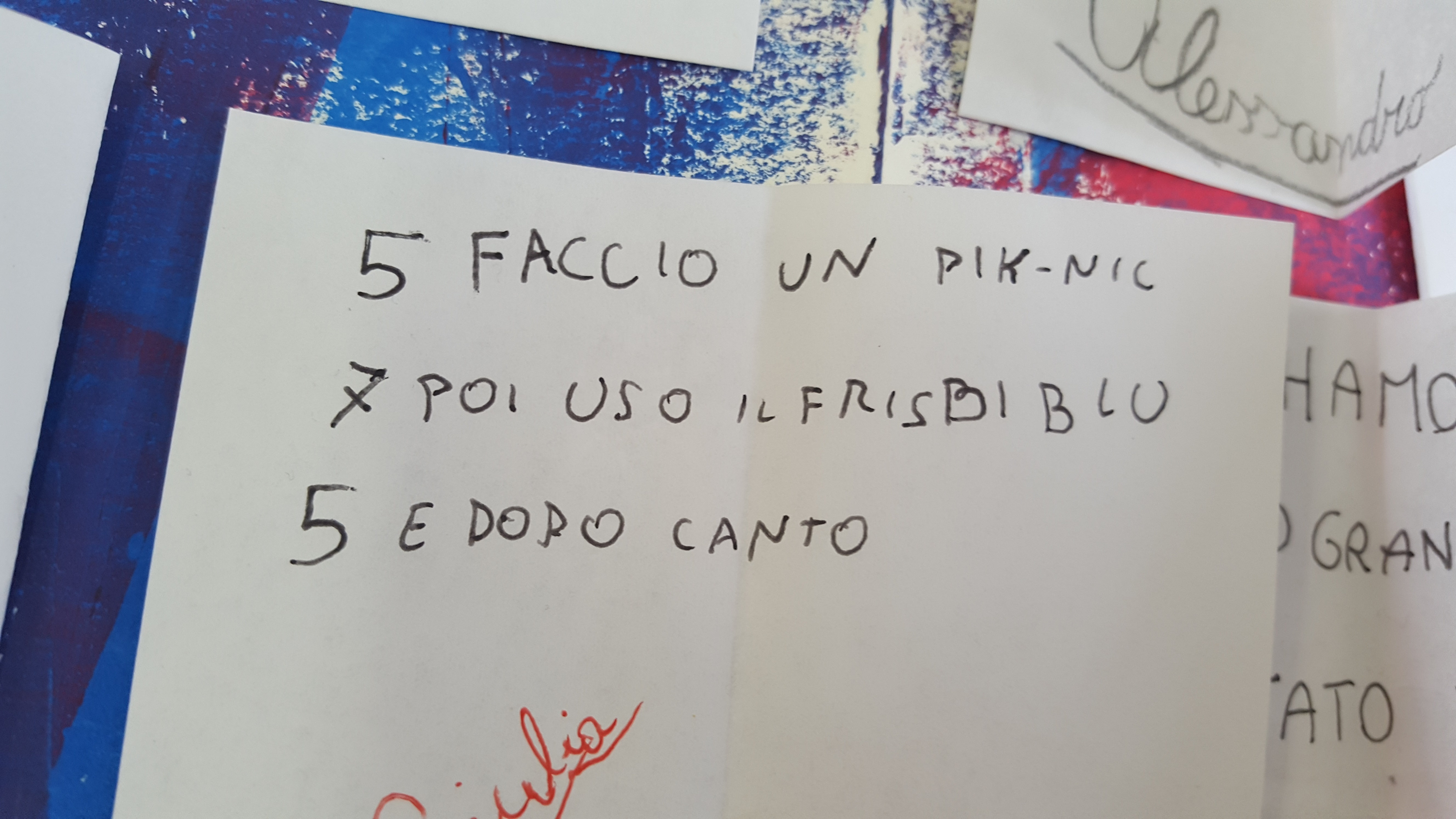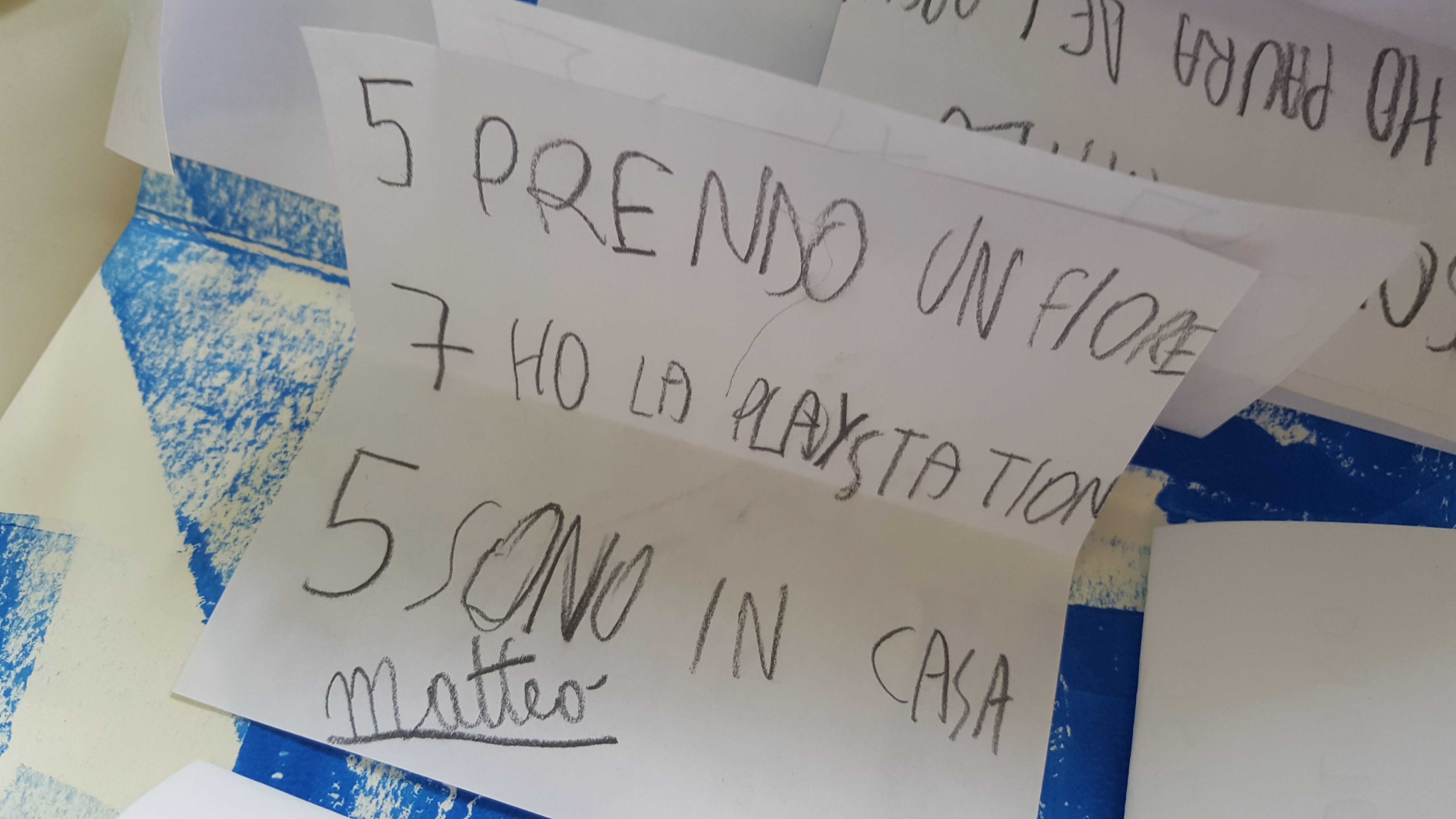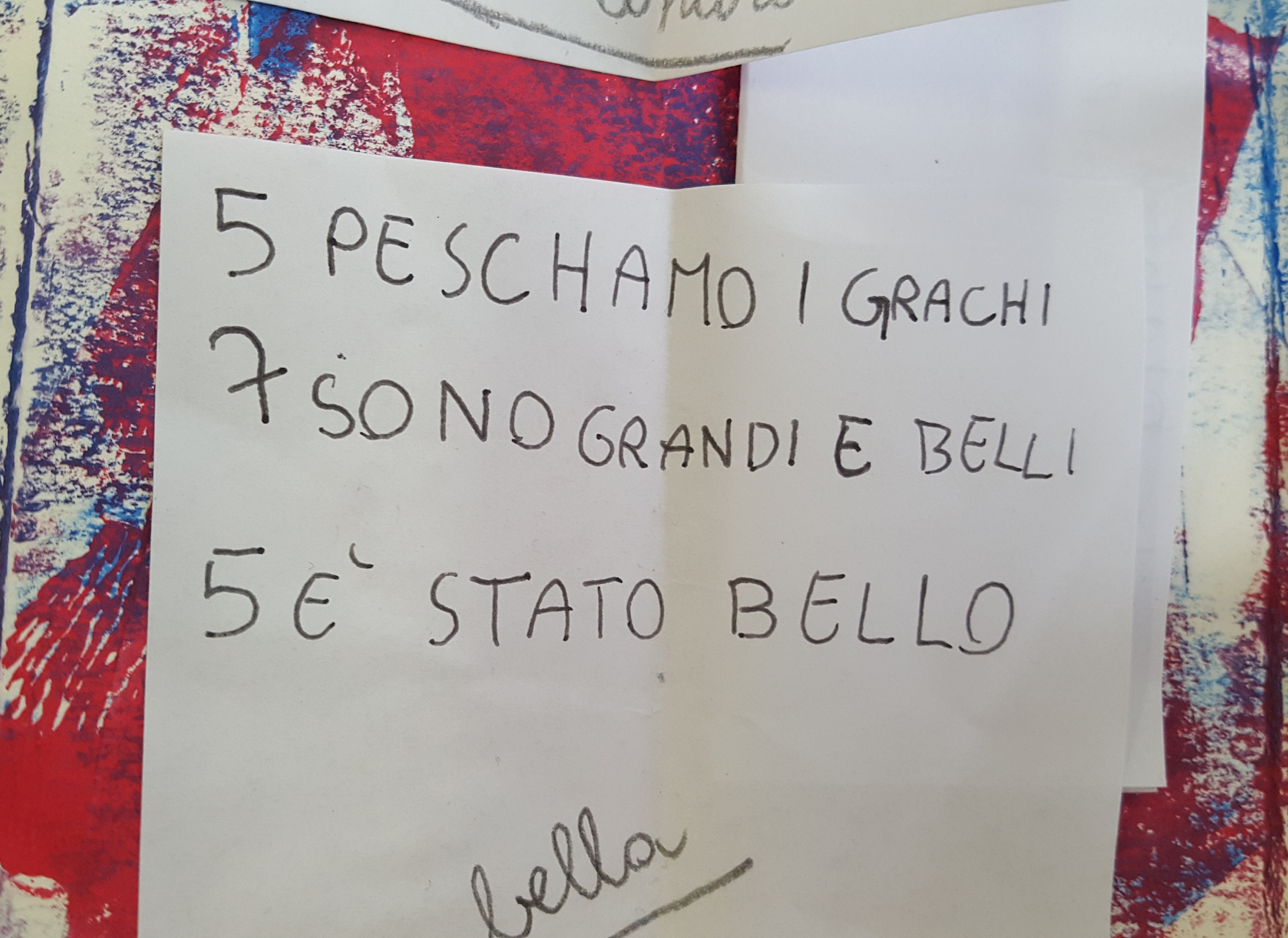 Oggi è il turno di una terza impetuosa. La forza è tale che non ho troppo tempo da dedicare a ciascun bambino, verificando il numero di sillabe e aggiustando i componimenti. Ma che importa? Qui c’è urgenza di scrivere, di giocare con le parole, di domare t-rex. Nella foga, escono umorismo e dolcezza, forse persino nuovi generi letterari (haiku incatenato?).