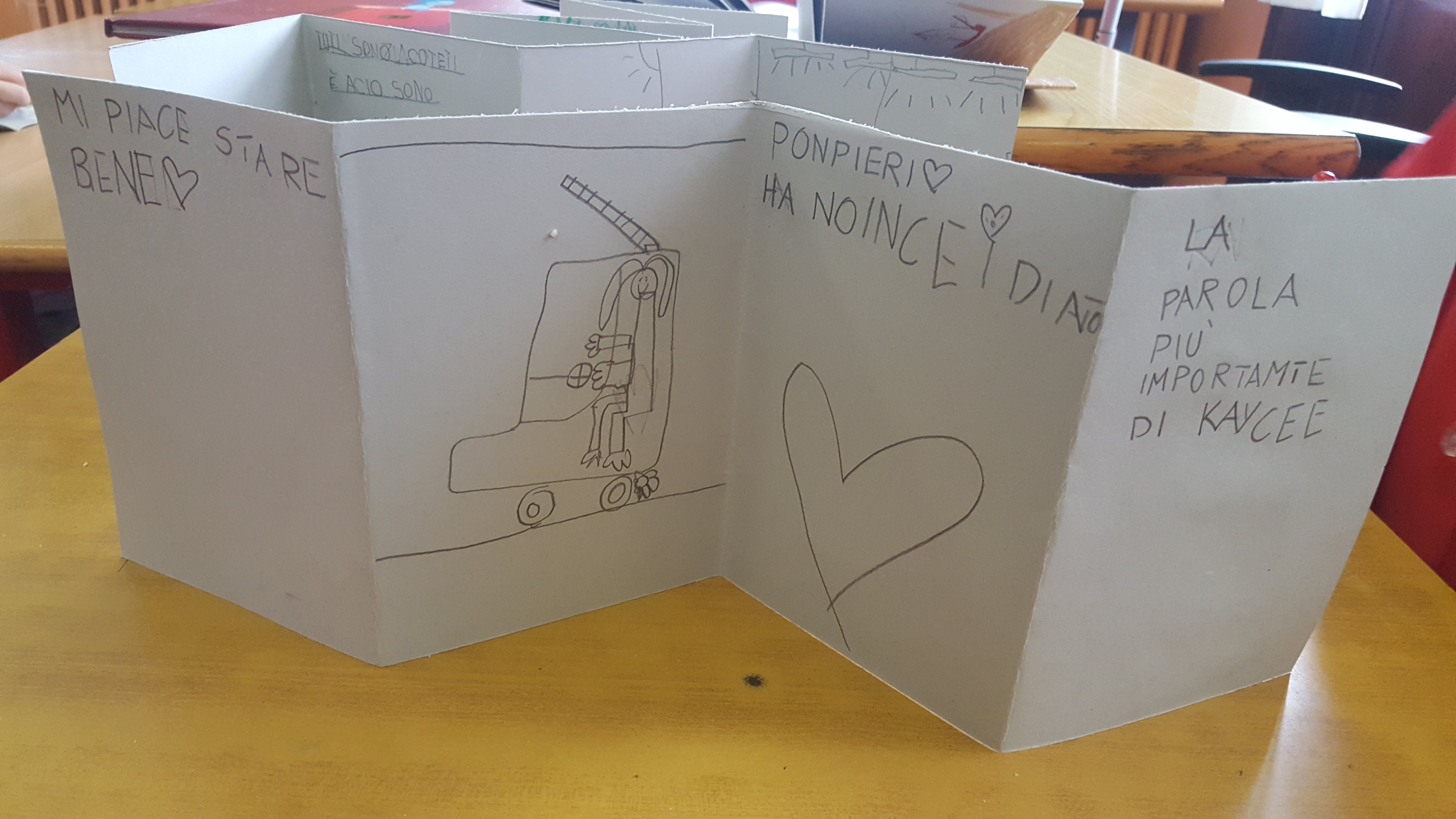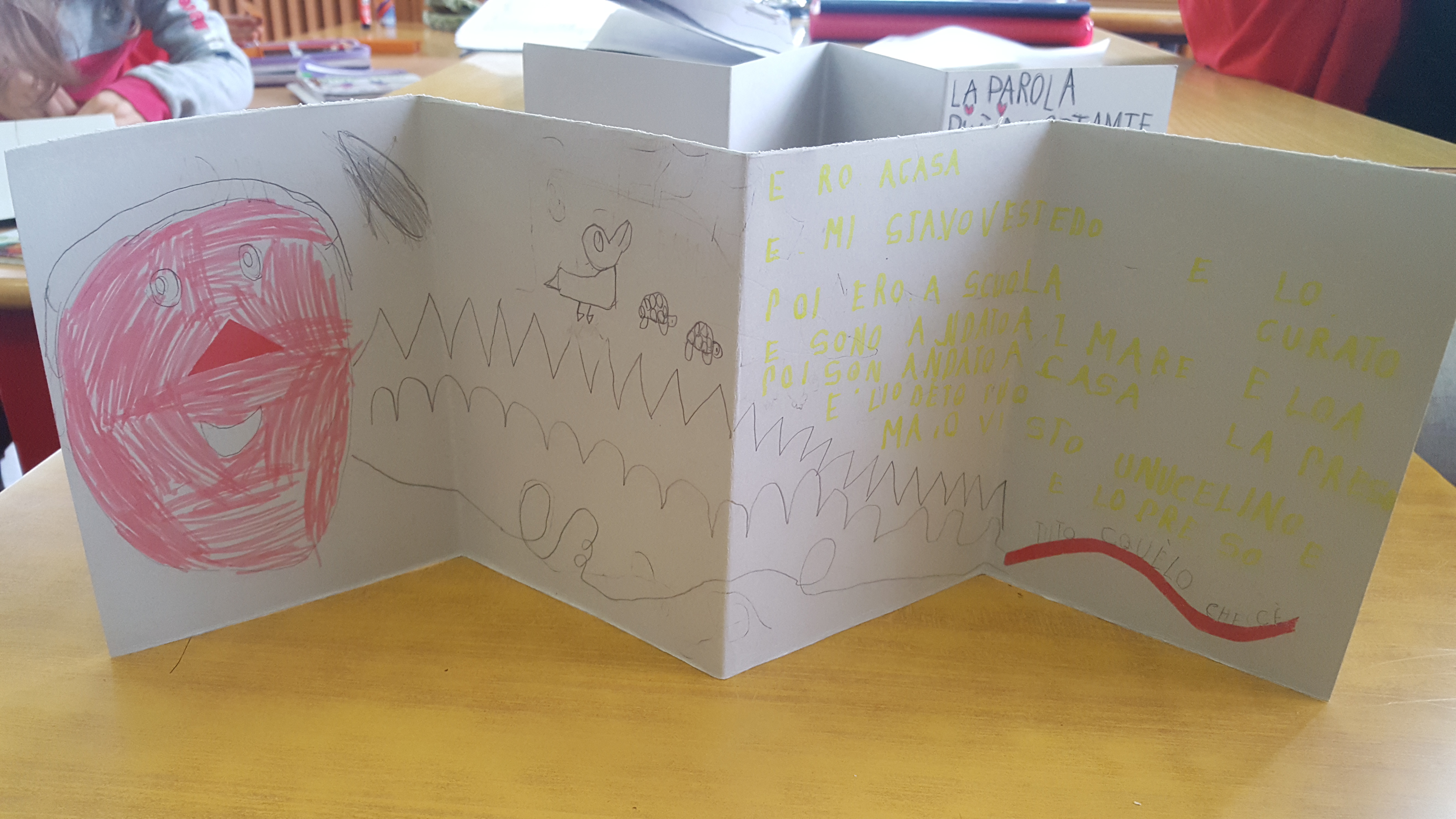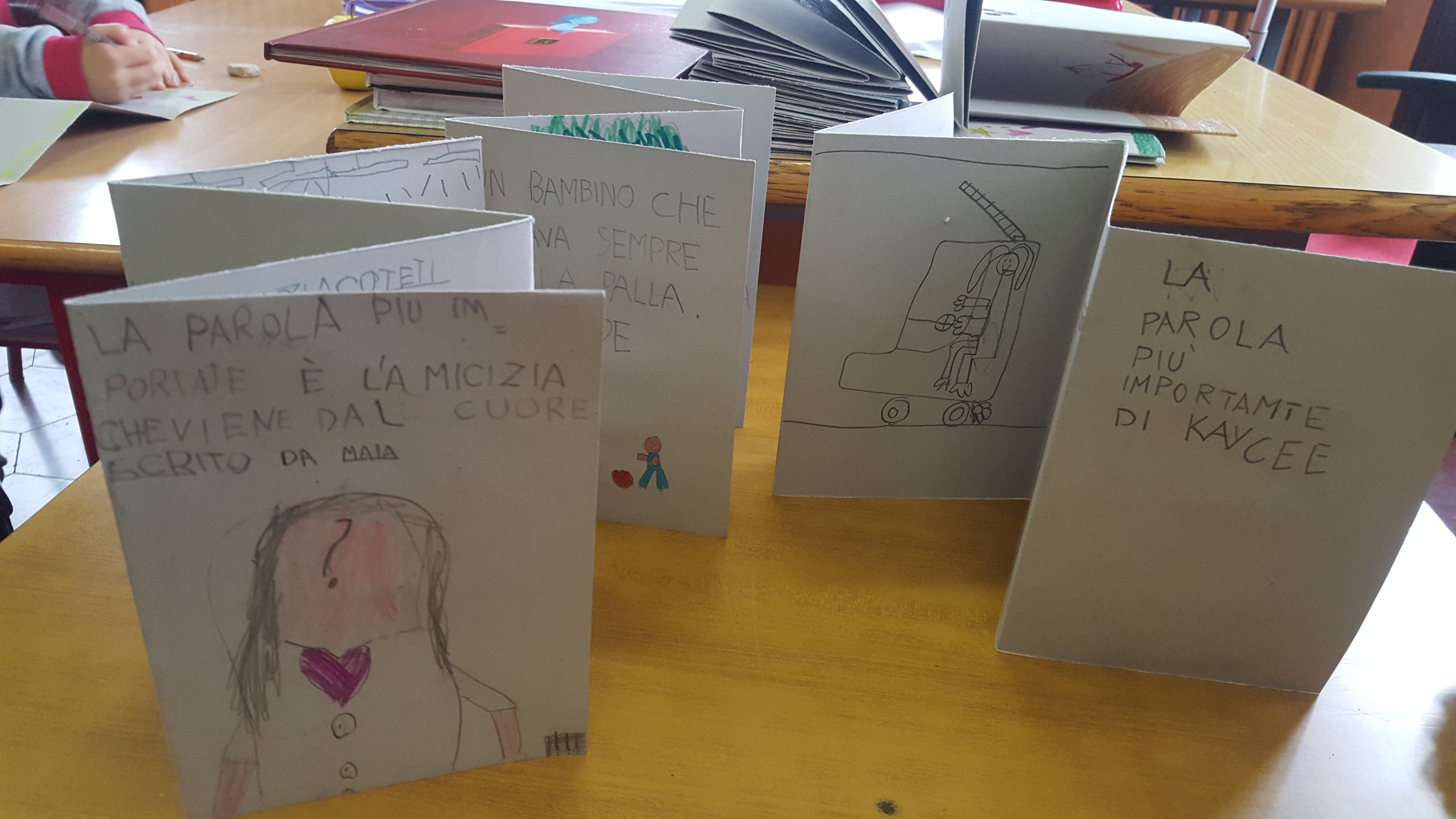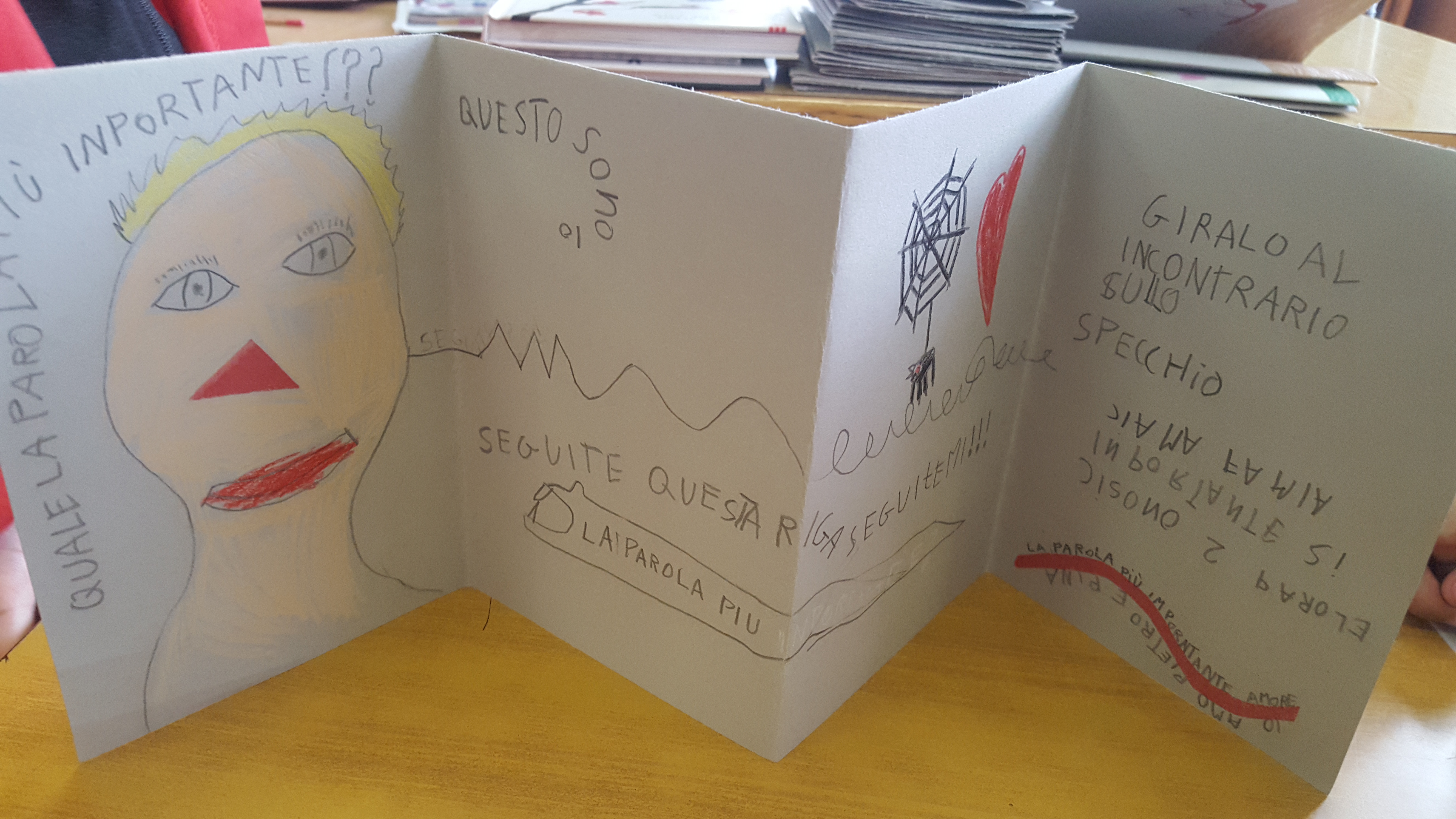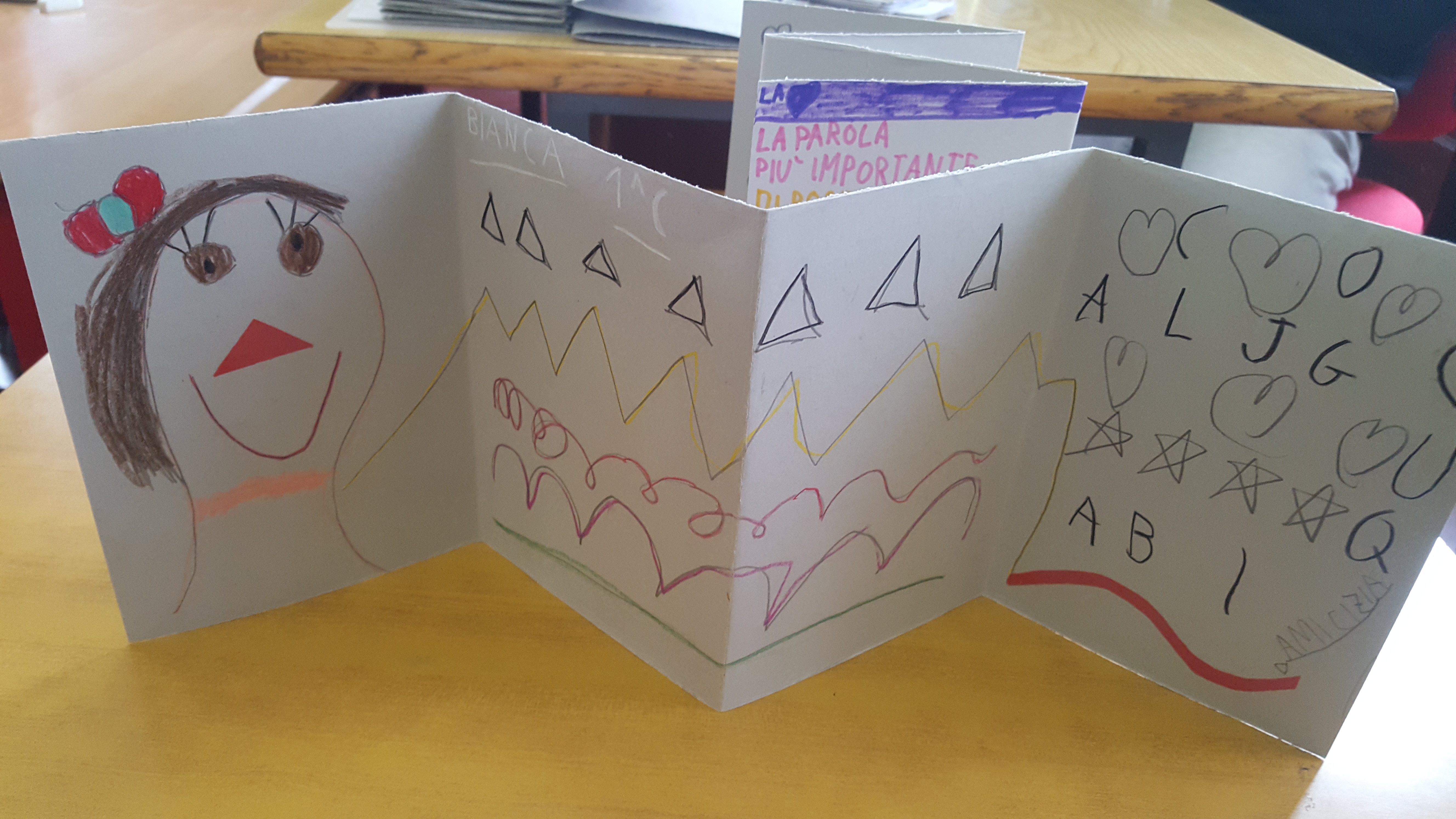 Perseguire il ben-essere (mi piace stare bene). Saperlo dire e scrivere, saggiamente, forte e chiaro. Riconoscere il lavoro dell’educatore (la parola più importante è Maestro). La scuola come luogo di gioia. La lettura come atto naturale, un piacere. Il disegno come motore della storia (due amici fanno la guerra per mangiare un biscotto). La parola per narrare o da sperimentare come elemento grafico: un’onda, una spirale, uno specchio.