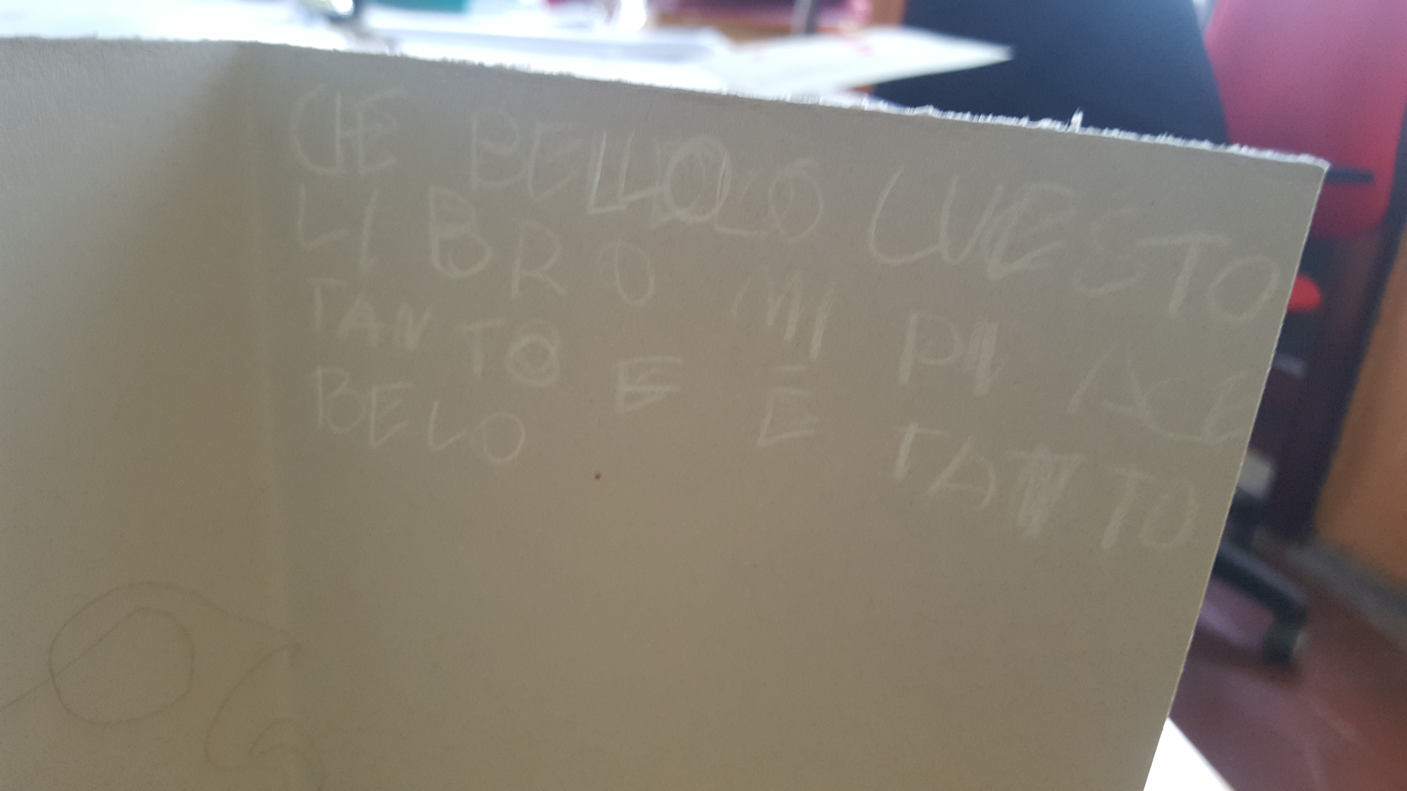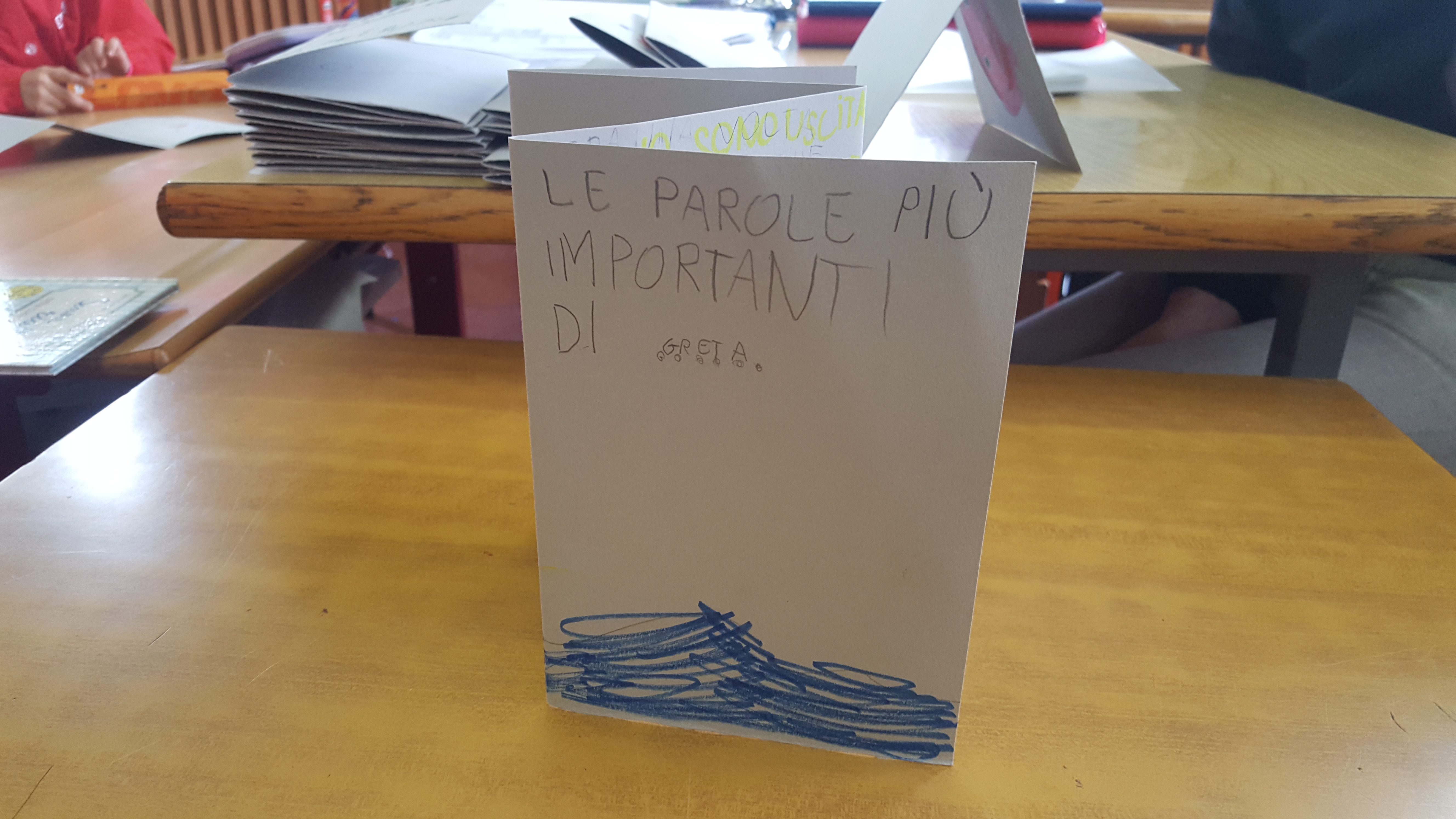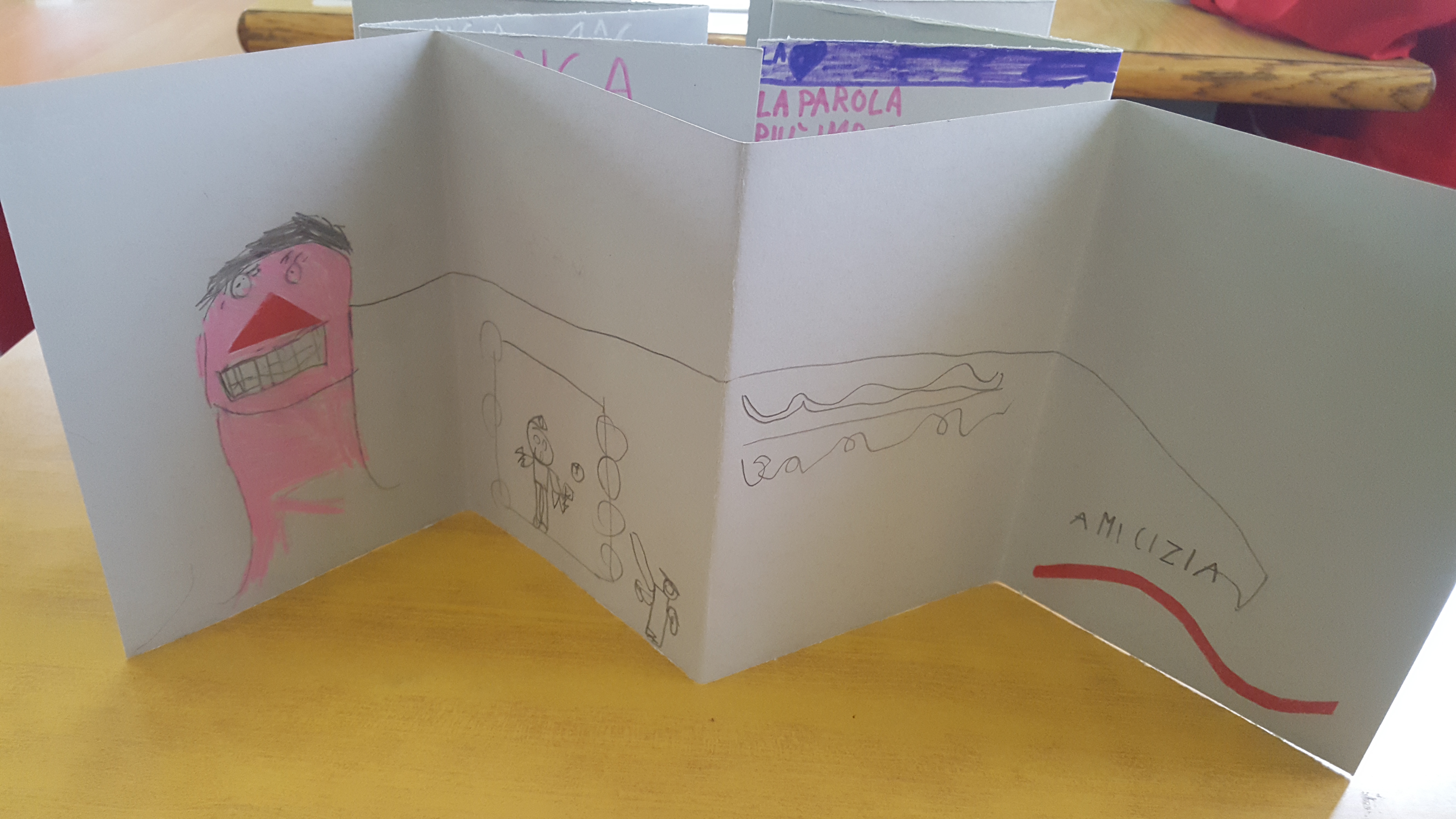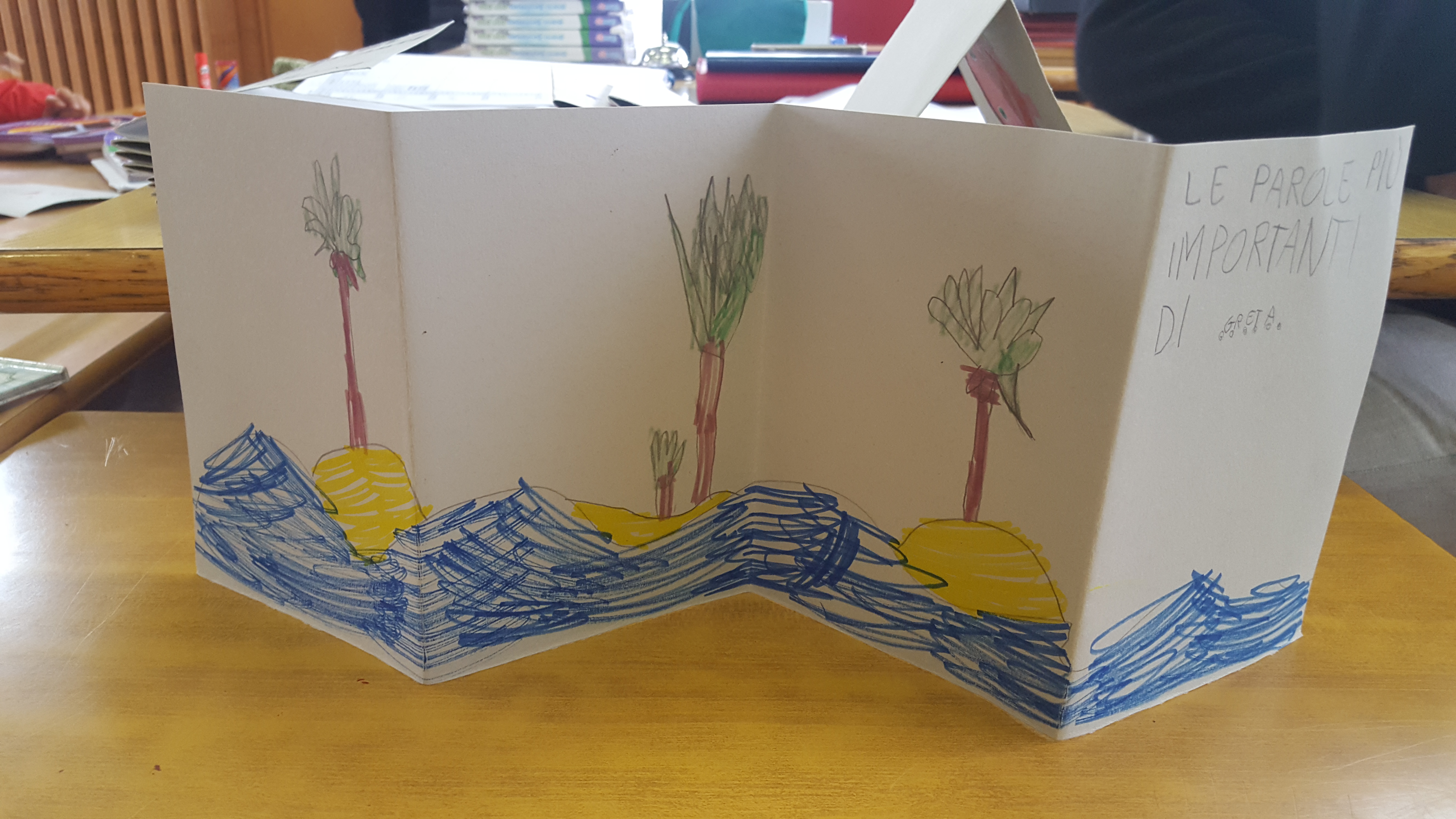 Perseguire il ben-essere (mi piace stare bene). Saperlo dire e scrivere, saggiamente, forte e chiaro. Riconoscere il lavoro dell’educatore (la parola più importante è Maestro). La scuola come luogo di gioia. La lettura come atto naturale, un piacere. Il disegno come motore della storia (due amici fanno la guerra per mangiare un biscotto). La parola per narrare o da sperimentare come elemento grafico: un’onda, una spirale, uno specchio.