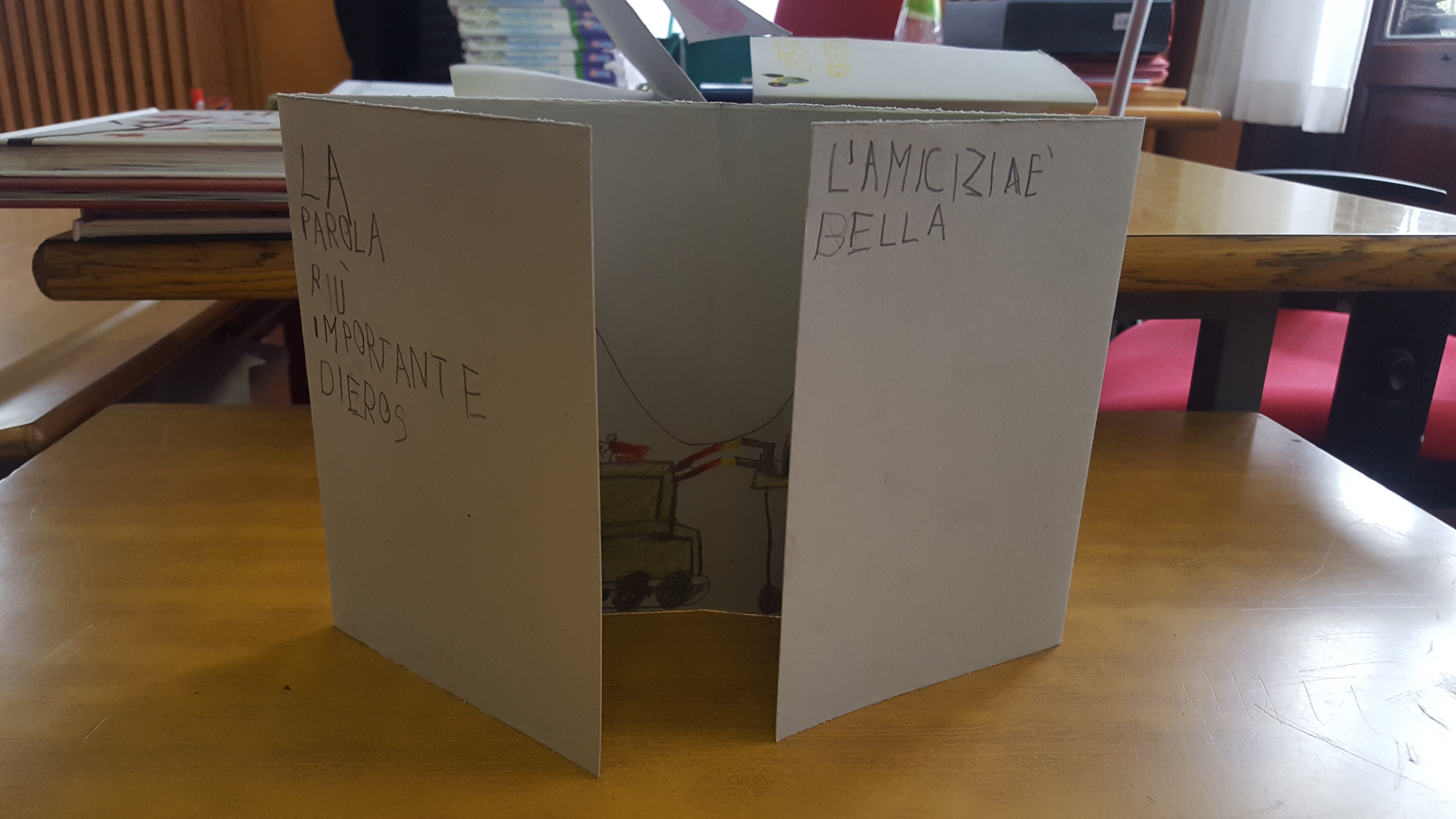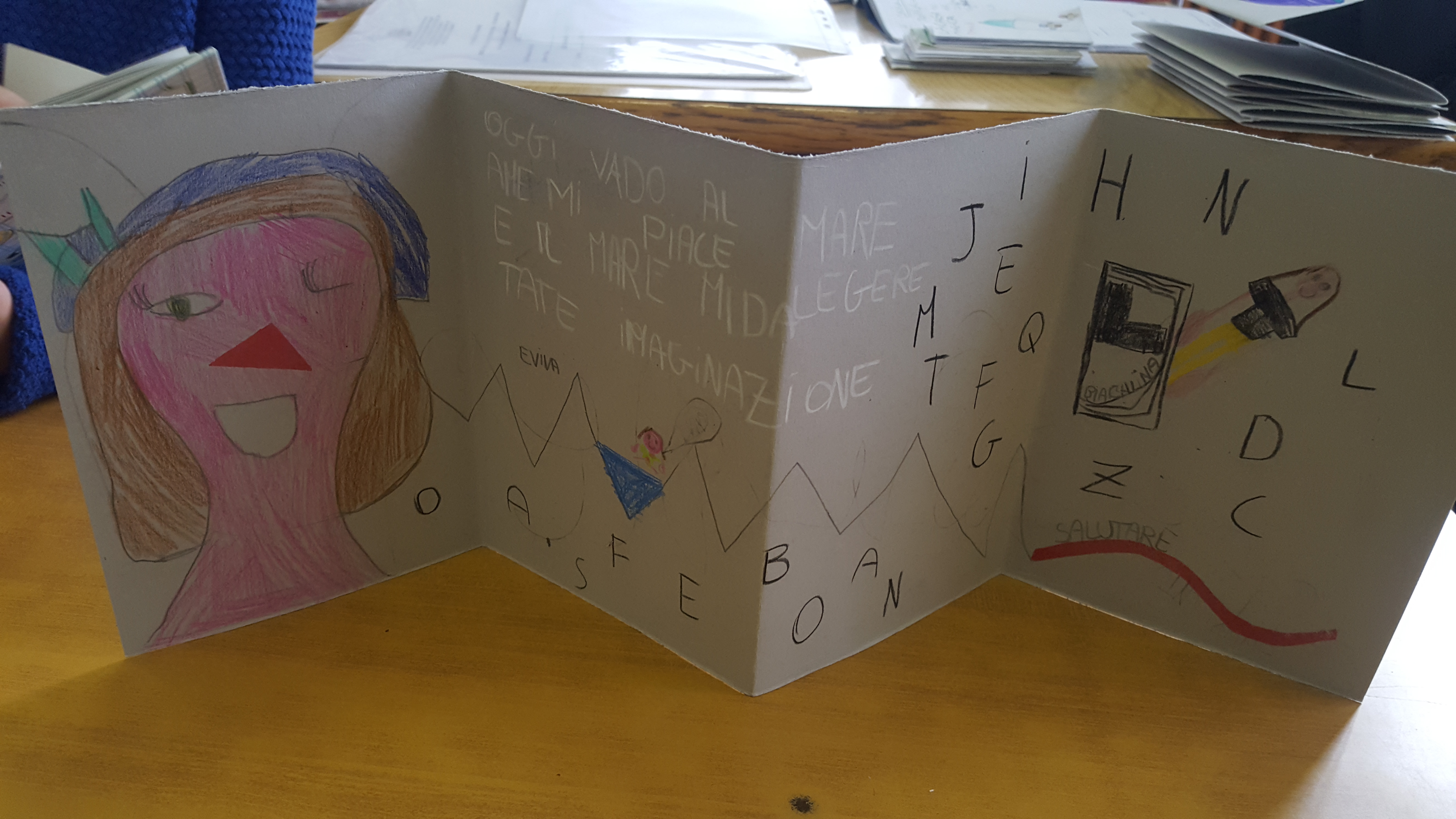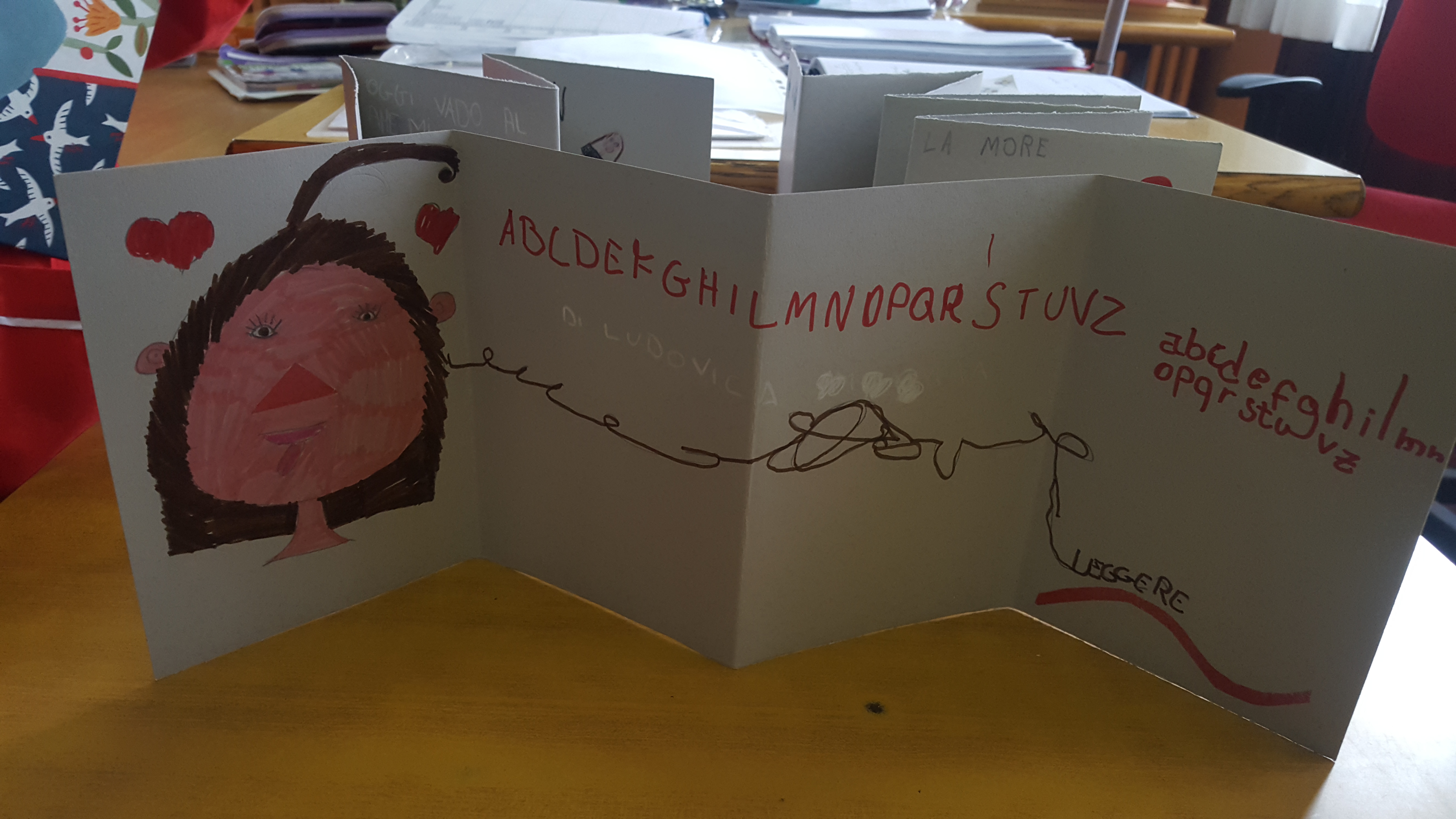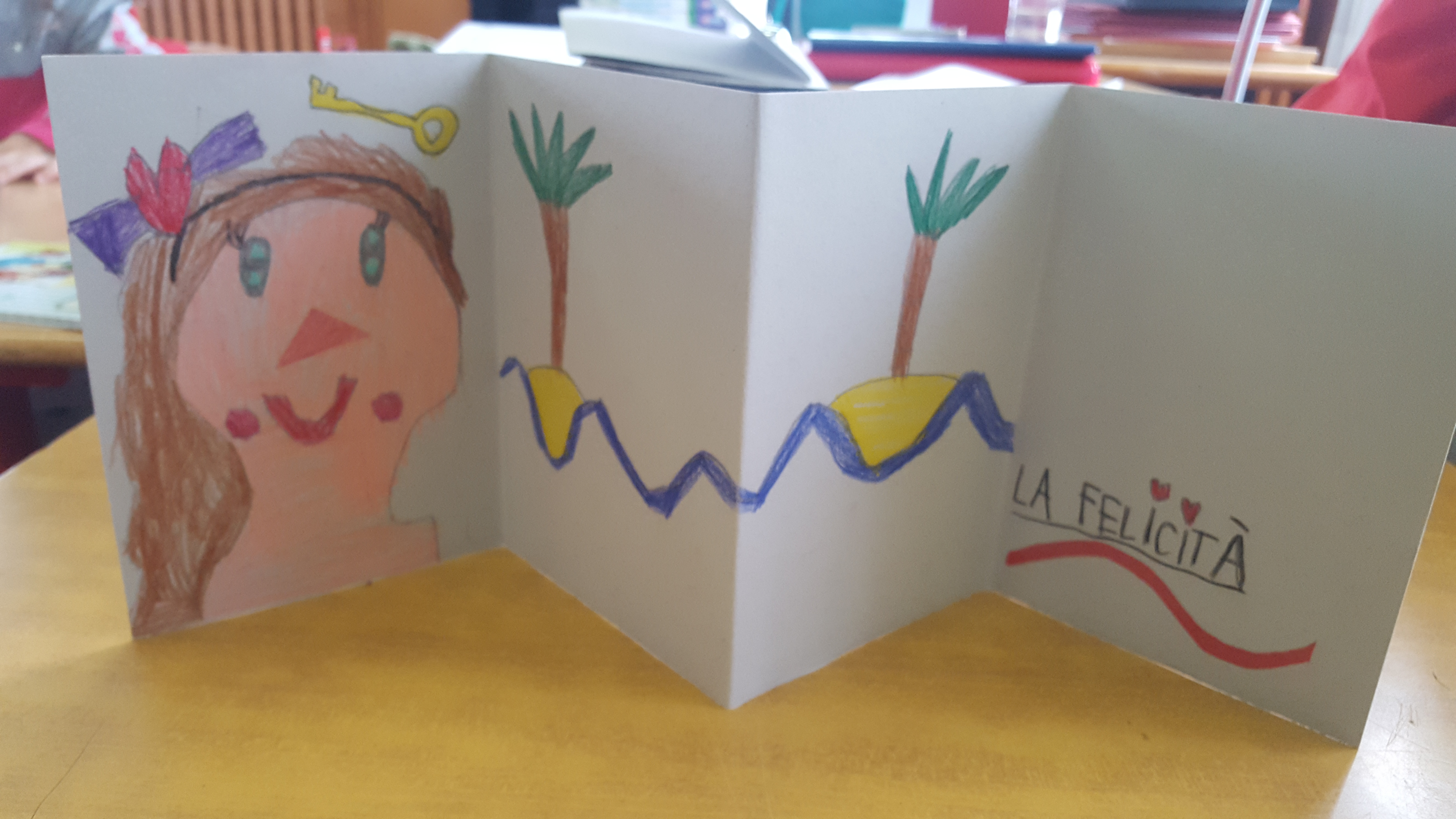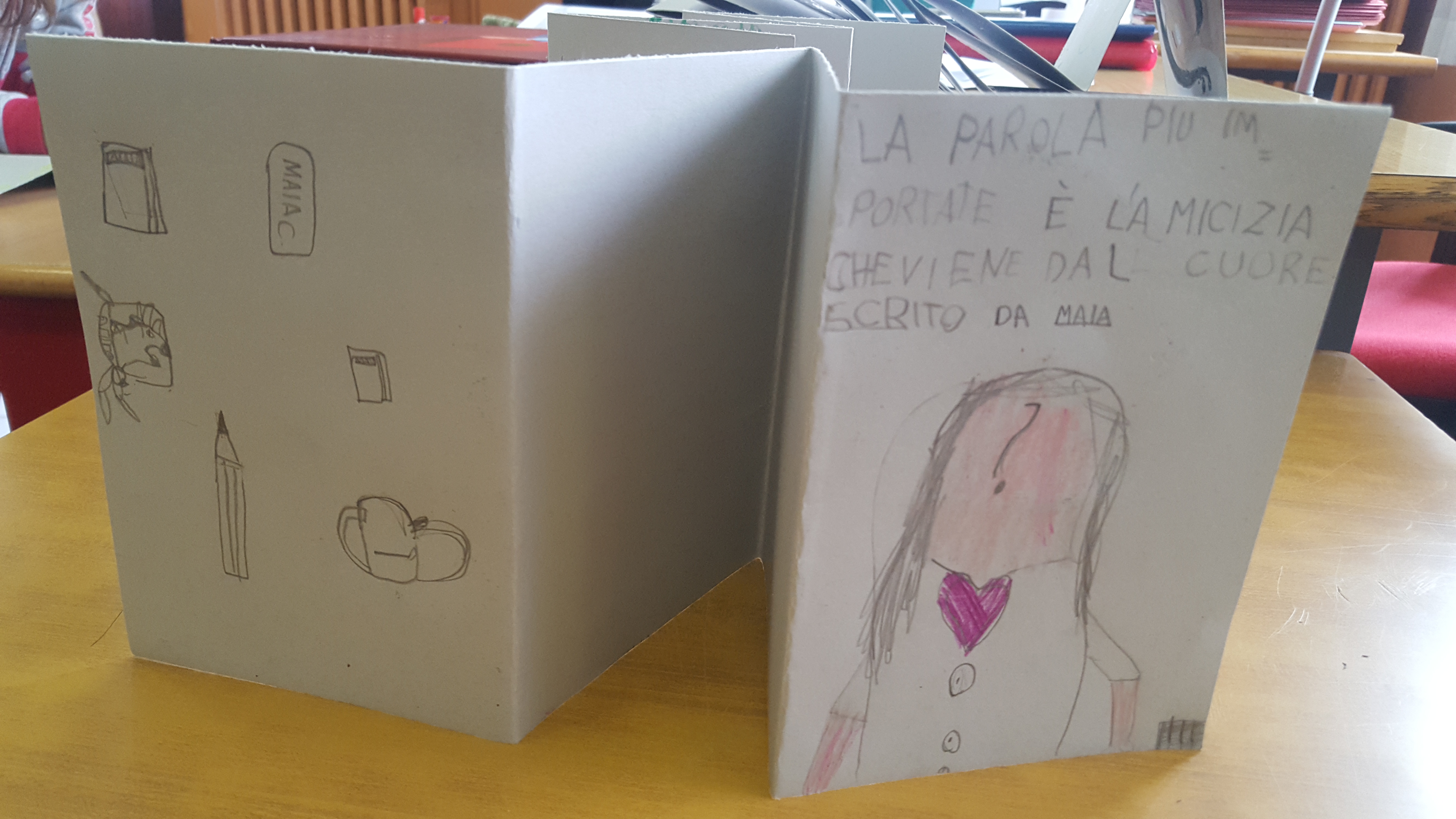 Perseguire il ben-essere (mi piace stare bene). Saperlo dire e scrivere, saggiamente, forte e chiaro. Riconoscere il lavoro dell’educatore (la parola più importante è Maestro). La scuola come luogo di gioia. La lettura come atto naturale, un piacere. Il disegno come motore della storia (due amici fanno la guerra per mangiare un biscotto). La parola per narrare o da sperimentare come elemento grafico: un’onda, una spirale, uno specchio.