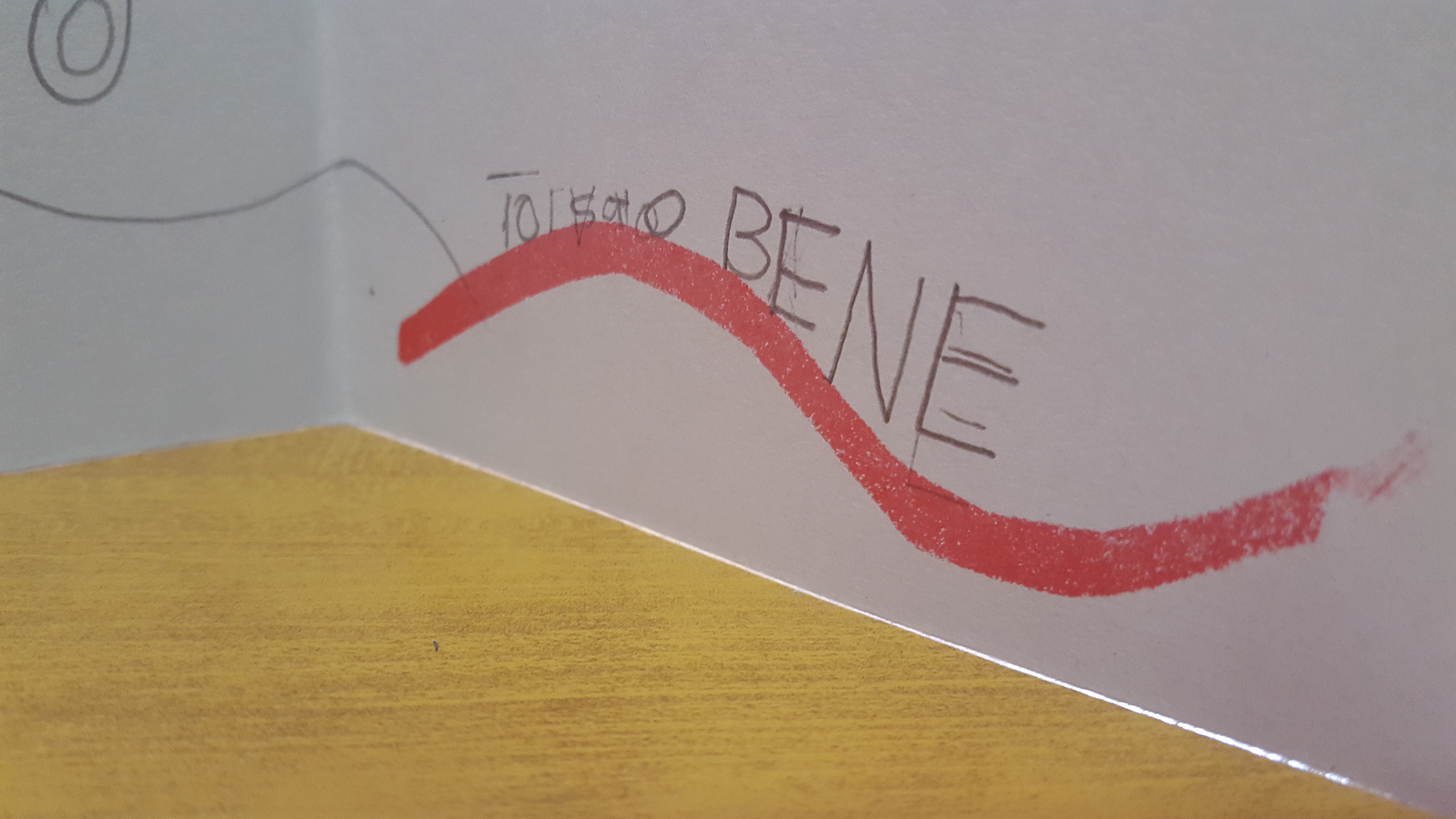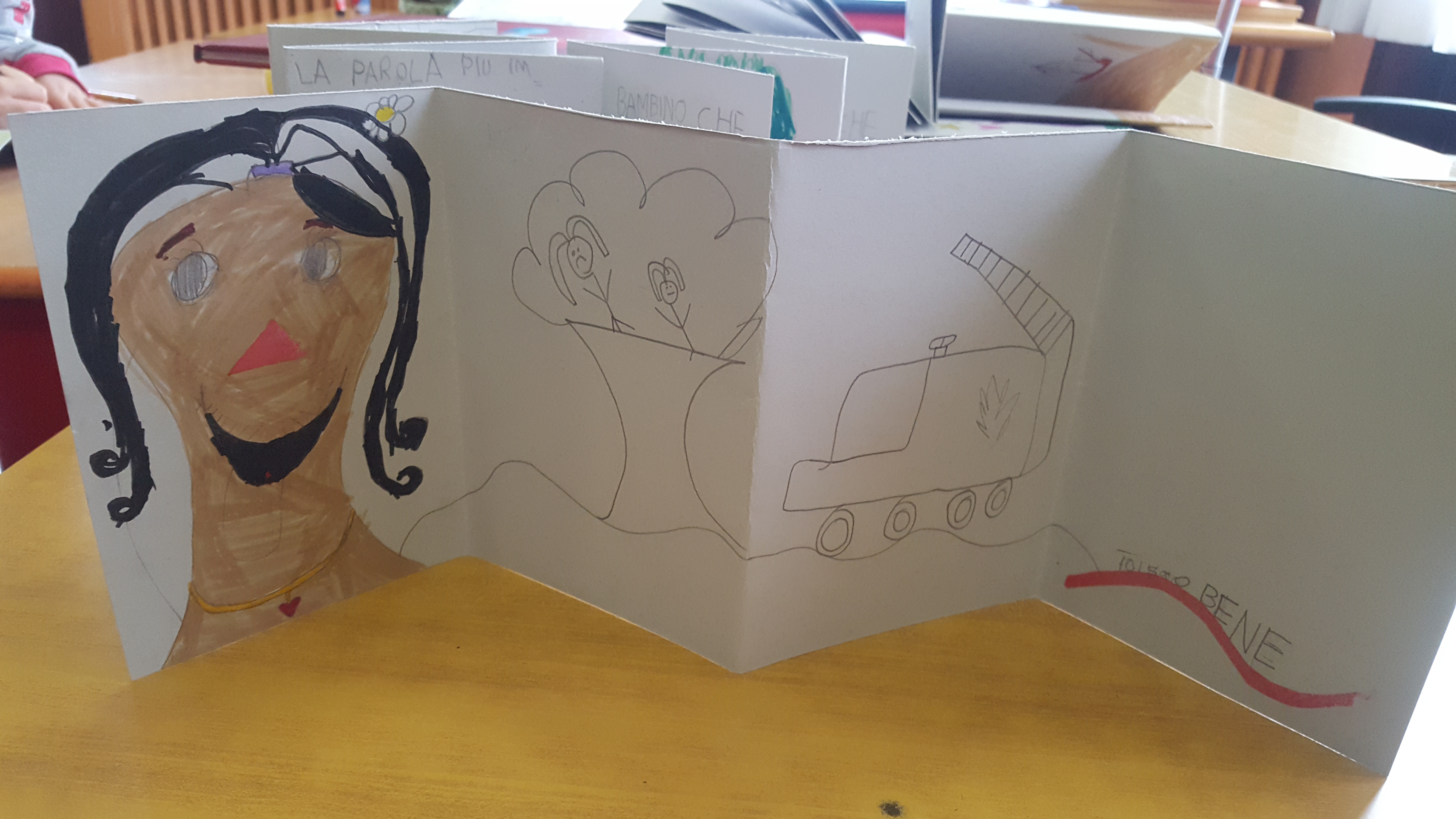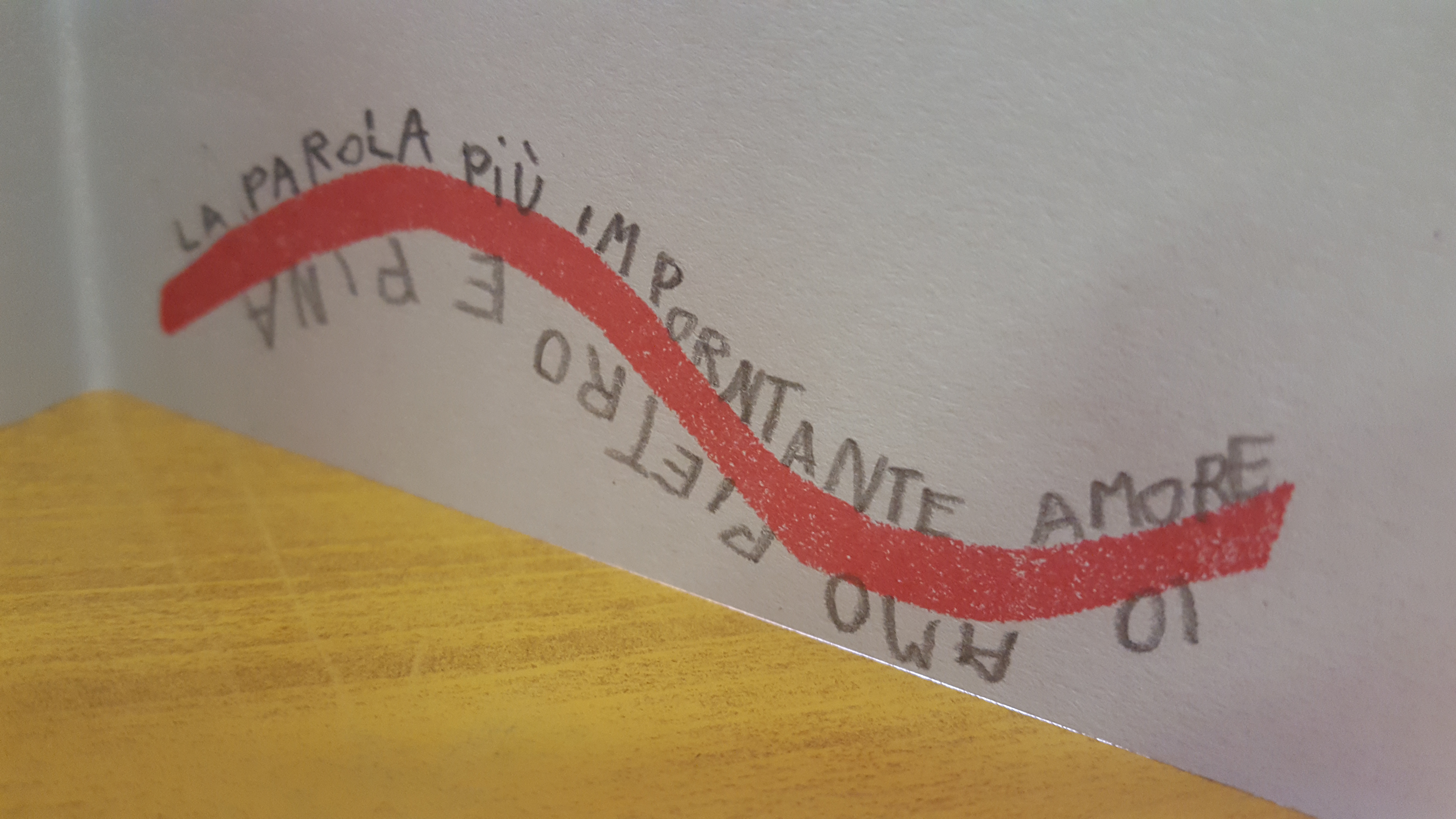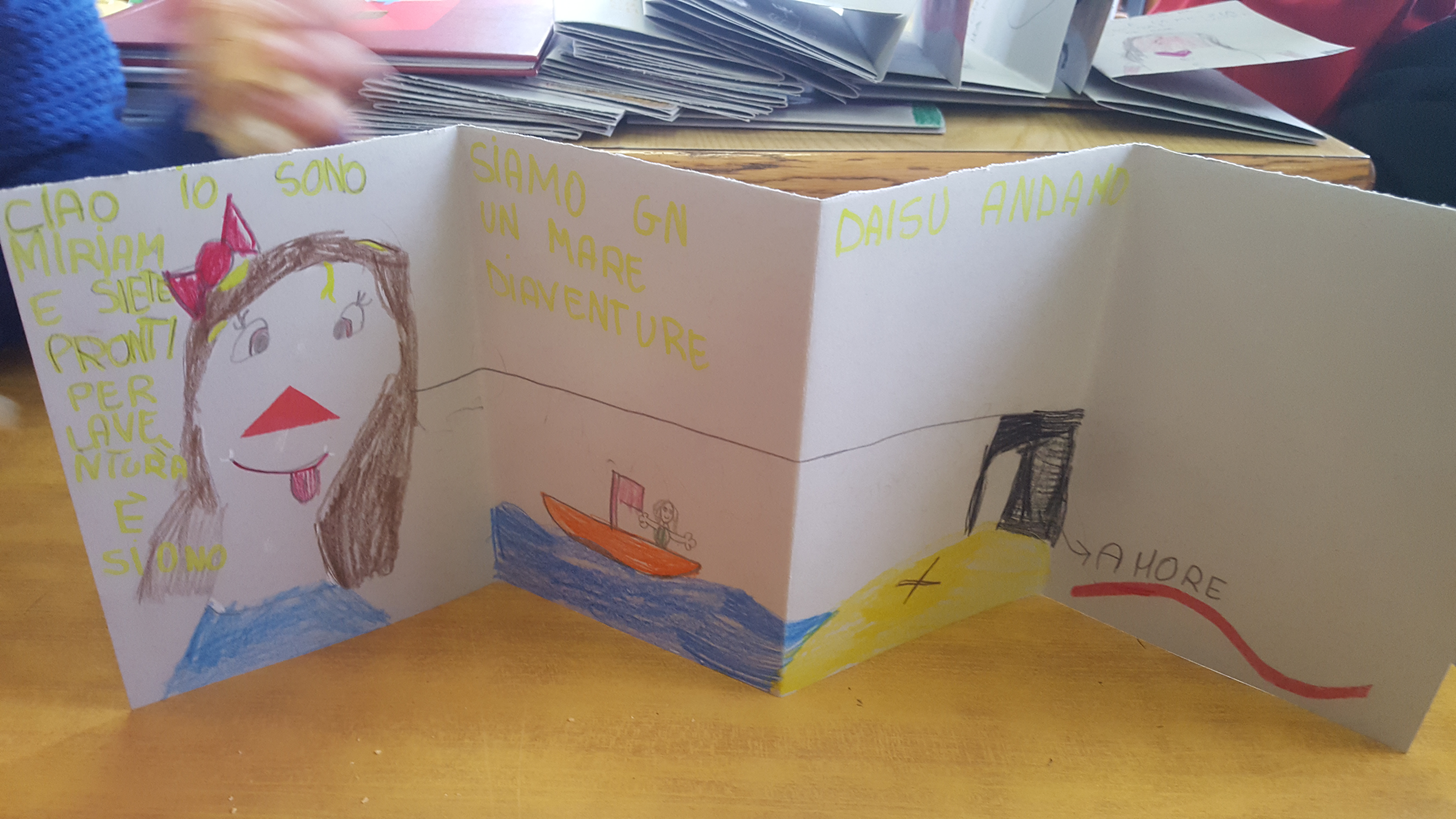 Perseguire il ben-essere (mi piace stare bene). Saperlo dire e scrivere, saggiamente, forte e chiaro. Riconoscere il lavoro dell’educatore (la parola più importante è Maestro). La scuola come luogo di gioia. La lettura come atto naturale, un piacere. Il disegno come motore della storia (due amici fanno la guerra per mangiare un biscotto). La parola per narrare o da sperimentare come elemento grafico: un’onda, una spirale, uno specchio.