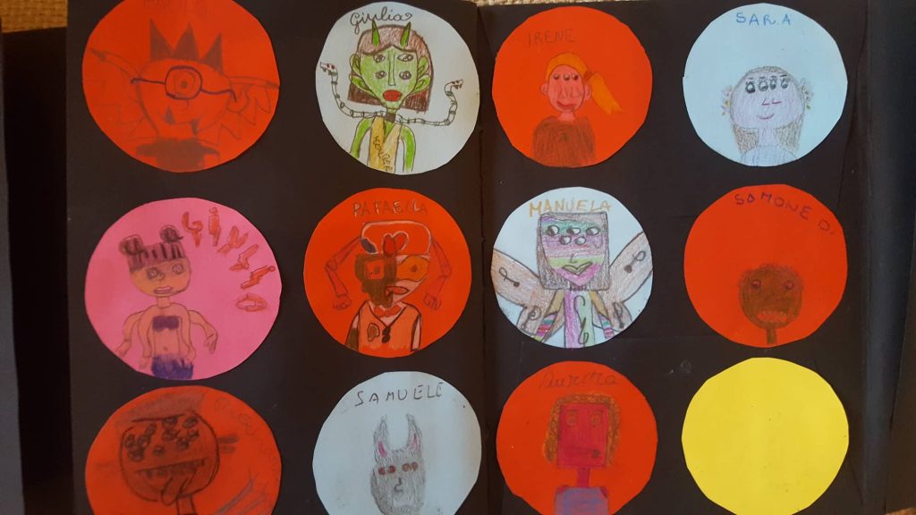 Quale argomento mette tutti d’accordo in quarta elementare? Lo sanno anche i sassi, i mostri! Eccoci a creare insieme un oscuro libro mostruoso ma anche molto divertente, perché in fondo i piccoli orchi fanno una vita normale, una vita come la nostra. Tanto che l’intera classe si rappresenta nei risguardi con un aspetto parecchio bizzarro.
