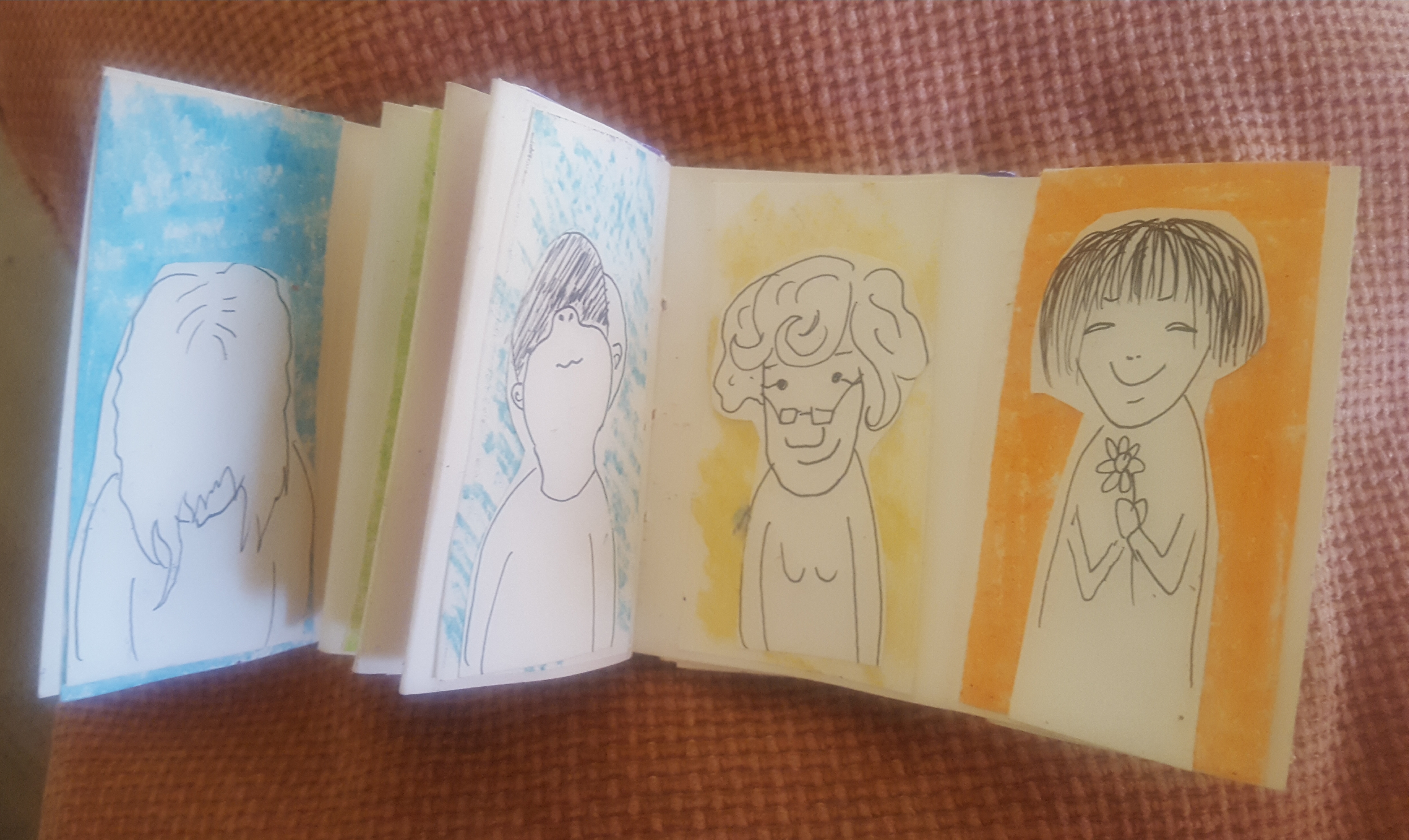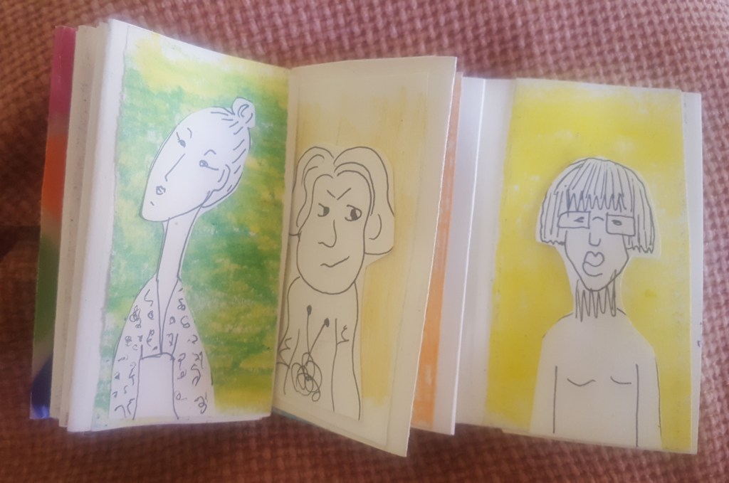 Come avete letto nell’attività precedente, l’impulso di disegnare personaggini a penna è irrefrenabile. Ne ho ritagliati cinquanta e li ho montati in un piccolo libro cucito con patelle simmetriche. Sfogliando le pagine e aprendo le patelle, nascono moltissime combinazioni. Dialoghi a due, a tre, a quattro. Cielo, che assembramenti di potenziali storie!