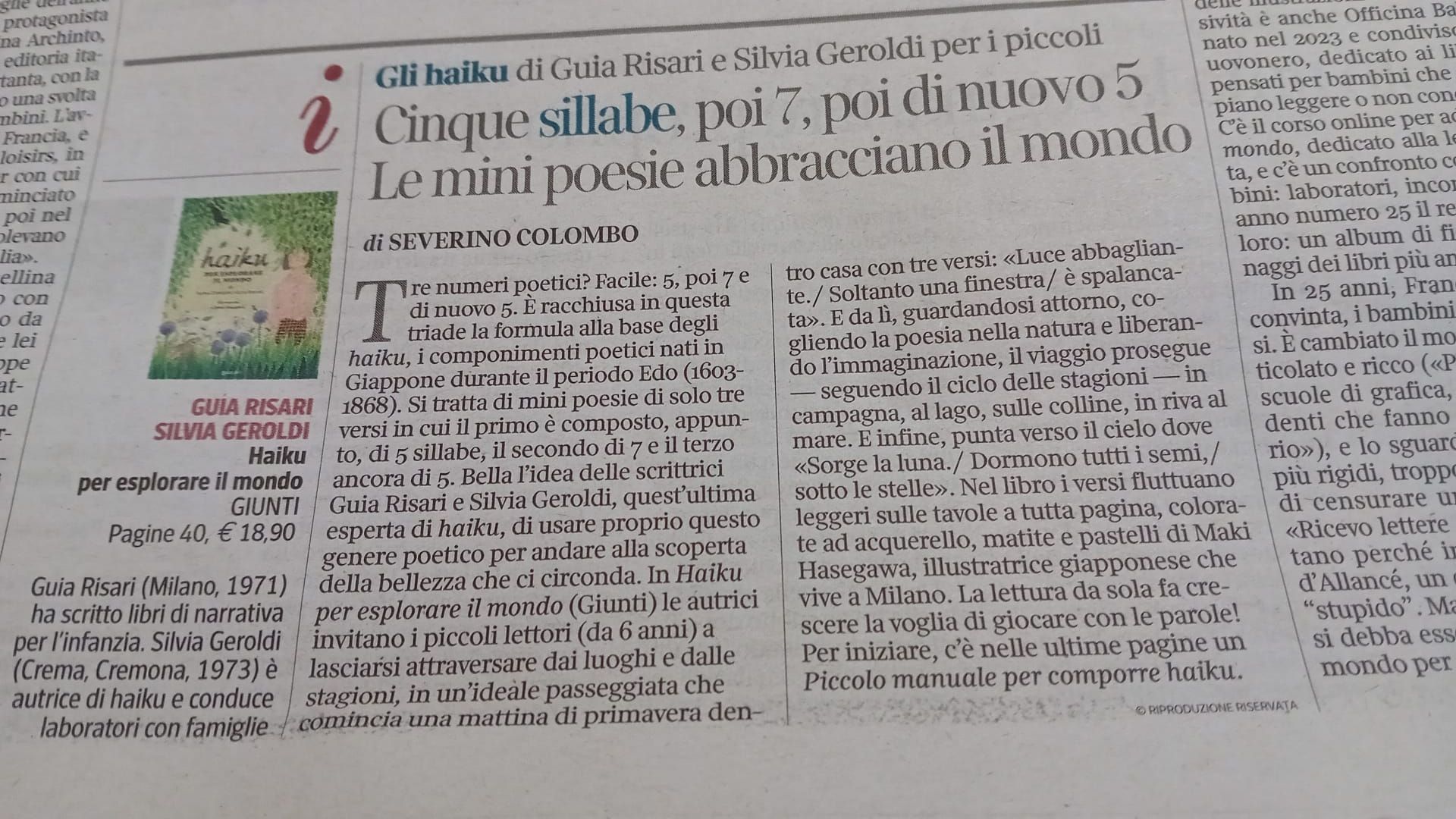 «[…] Bella l’idea delle scrittrici Guia Risari e Silvia Geroldi, quest’ultima esperta di haiku, di usare proprio questo genere poetico per andare alla scoperta della bellezza che ci circonda. […] Nel libro i versi fluttuano leggeri sulle tavole a tutta pagina, colorate ad acquarello, matite e pastelli di Maki Hasegawa […]. La lettura da sola fa crescere la voglia di giocare con le parole! Per iniziare c’è nelle ultime pagine un Piccolo manuale per comporre haiku.»